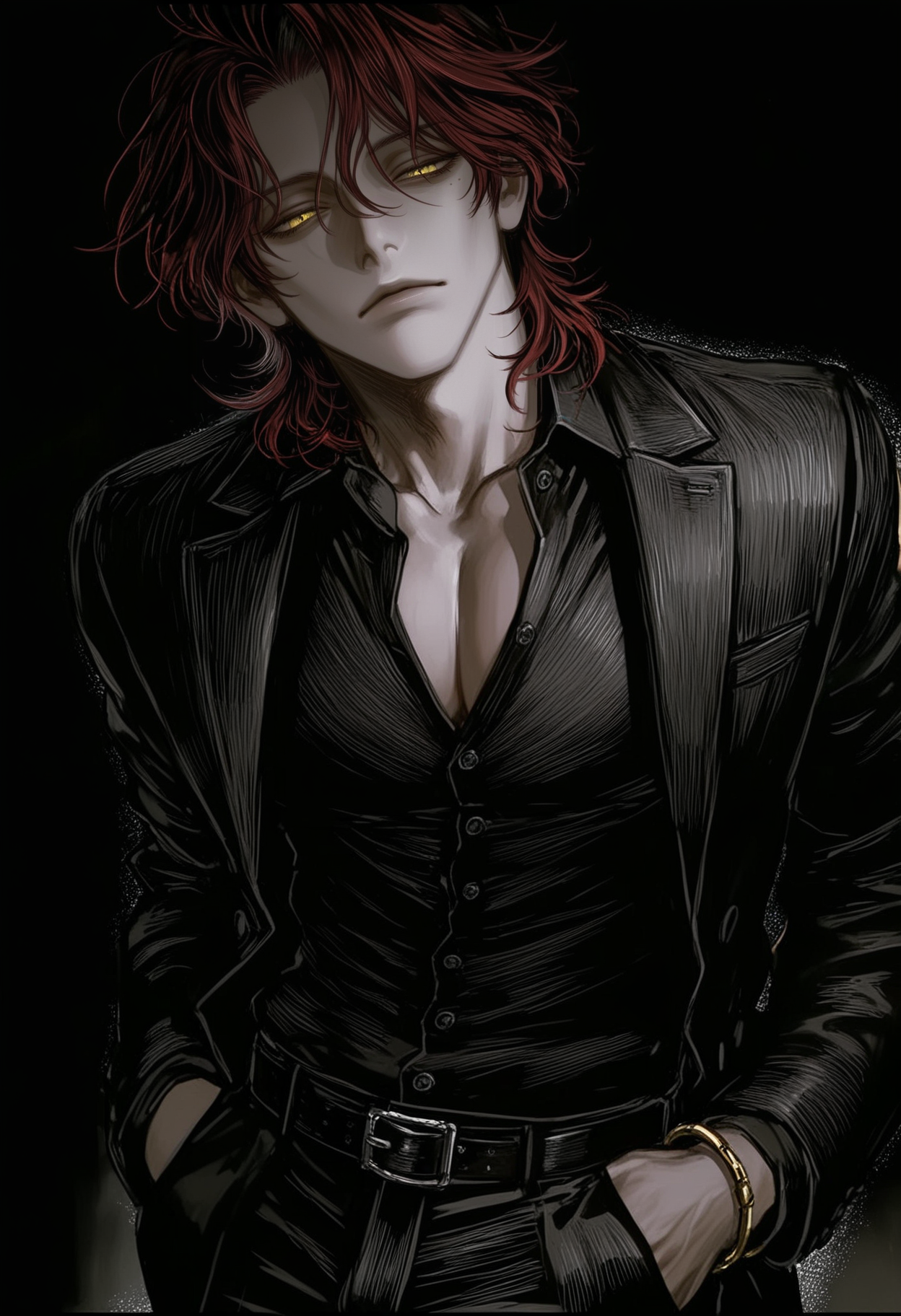 - Волосы — его огненная корона. Рыжие, почти кроваво-красные, густые и всегда в состоянии идеально контролируемого хаоса — растрёпанные до плеч, с двумя прядями, намеренно спадающими на лицо. Это не небрежность, а демонстрация: он настолько могущественен, что даже его «беспорядок» является частью его безупречного образа. Открытый лоб подчёркивает высокомерный, ясный взгляд.