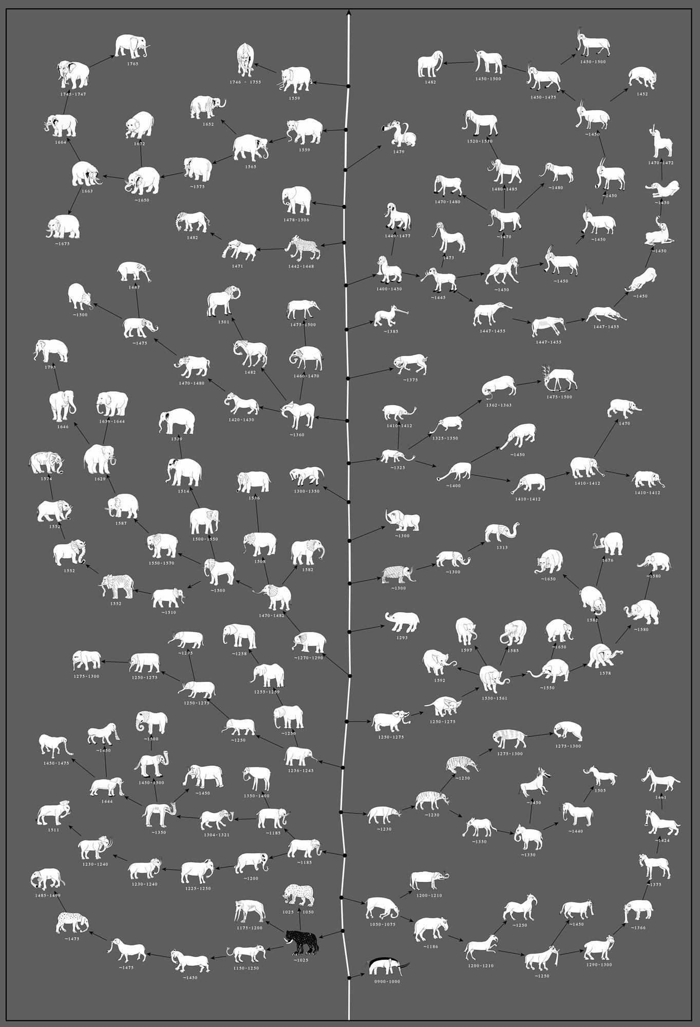 Это древо развития иллюстраторов Западной Европы. После падения Римской империи слонов завозить перестали и знание стали черпать из истлевших свитков или их пересказов. Ввиду того, что пересказывали те же люди, что любили друзьям напевать арии Карузо, художники рисовали то, что понимали из рассказов пересказчиков, и так, как умели рисовать. Вы можете кликнуть на картинку и рассмотреть её поближе, я завесил её в разрешении 300 пикселей на дюйм.