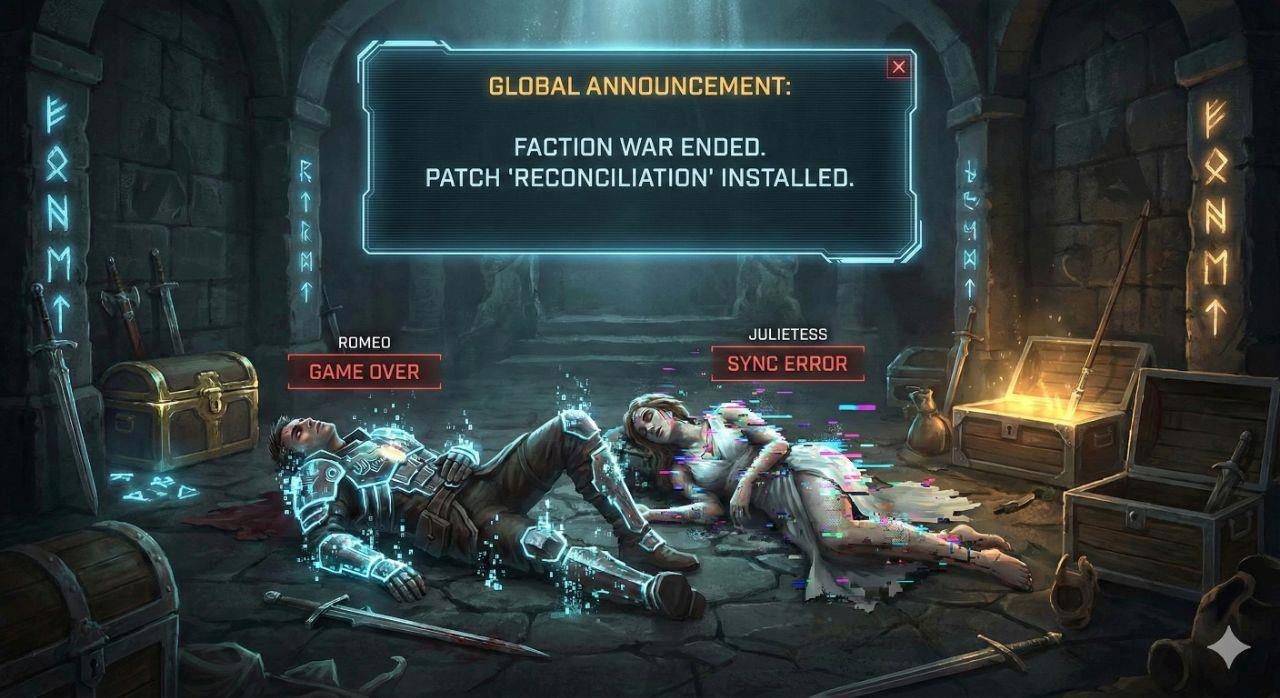 [Глобальный чат]: Внимание всем игрокам! Фракционная война между Монтекки и Капулетти завершена. Из-за критической ошибки в квестовой линии оба наследника удалили своих персонажей.