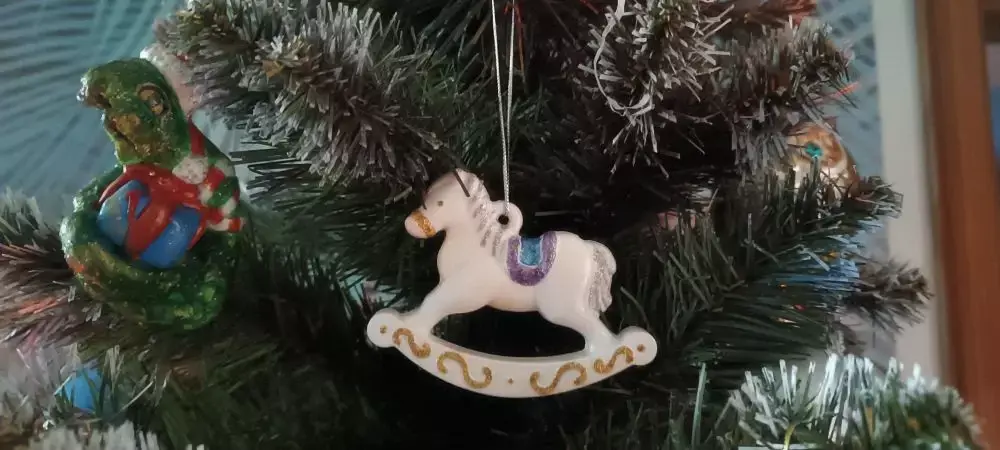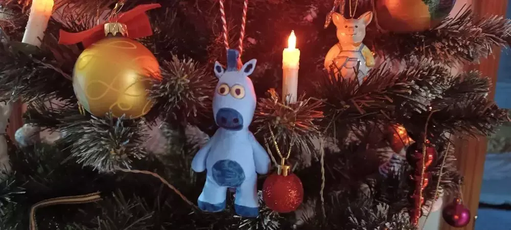 И старший внук сделал лошадку из воздушного пластилина. Она застыла, он ее раскрасил и она меня радовала все новогодние праздники. Может быть она отдаленно напоминает ослика, но он сказал, что это лошадка и я ему верю.