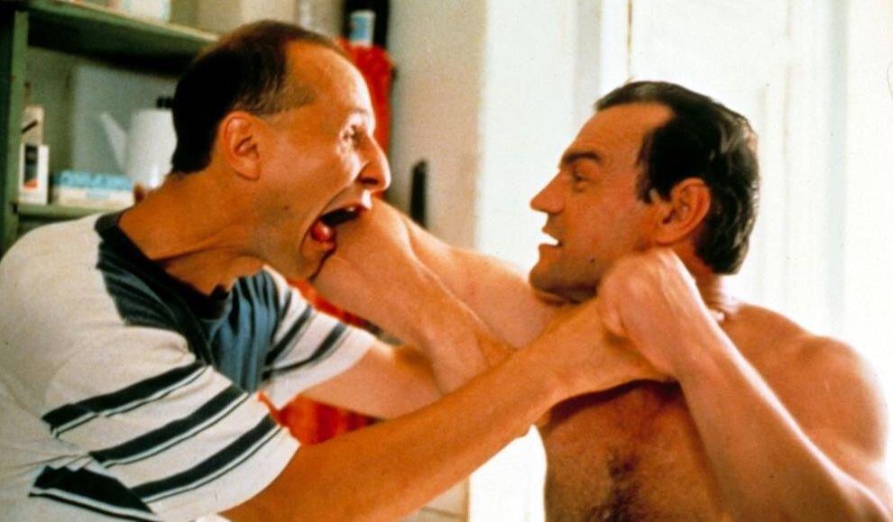 Не знаю, ставилась такая задача автором сценария или режиссером, но на протяжении всего экранного времени Шлыков ведет себя пусть и грубо, но сдержано, насколько это вообще возможно, а саксофонист – предельно безумно и совершенно неадекватно, причем даже в простых ситуациях идет на конфликт, т. е. демонстрирует полную НЕвыживаемость в мире. Саксофонист ведет себя как сумасшедший, а временами и как подлец и ничтожество, Шлыков примерно с середины фильма начинает вести себя как «мама в брюках», и заботится об упавшем на его голову «интеллигенте» как о маленьком ребенке, примерно 2-4 летнего возраста.