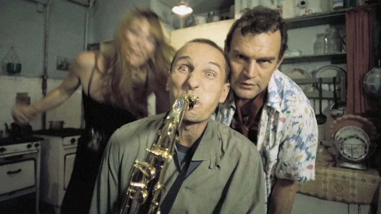Итак, фильм начинается с того, что суровый Ваня Шлыков несется в своем такси по ночной Москве, а в пассажирах у него группа пьянющих отморозков как ни странно средних лет и «интеллигентного» вида, группа этаких переросших подростков накаченных под завязку алкоголем и которым все мало и хочется еще. Таксист Ваня Шлыков в контакте с этим совершенным интелегенским быдлом выглядит грозно и степенно, а из толпы беснующихся обоего пола четко выделяется самый отмороженный и самый одичавший персонаж, он и есть наш герой… «гениальный саксофонист».