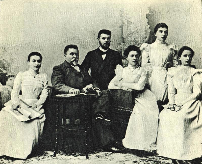 Сафонов с учениками. Слева направо: Розина Левина, В. И. Сафонов, Александр Гедике, Елена Бекман-Щербина, Олимпиада Кардашёва, Аглаида Фридман