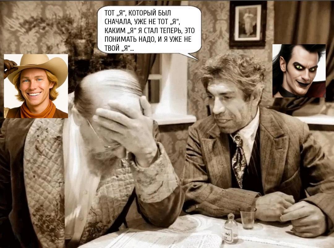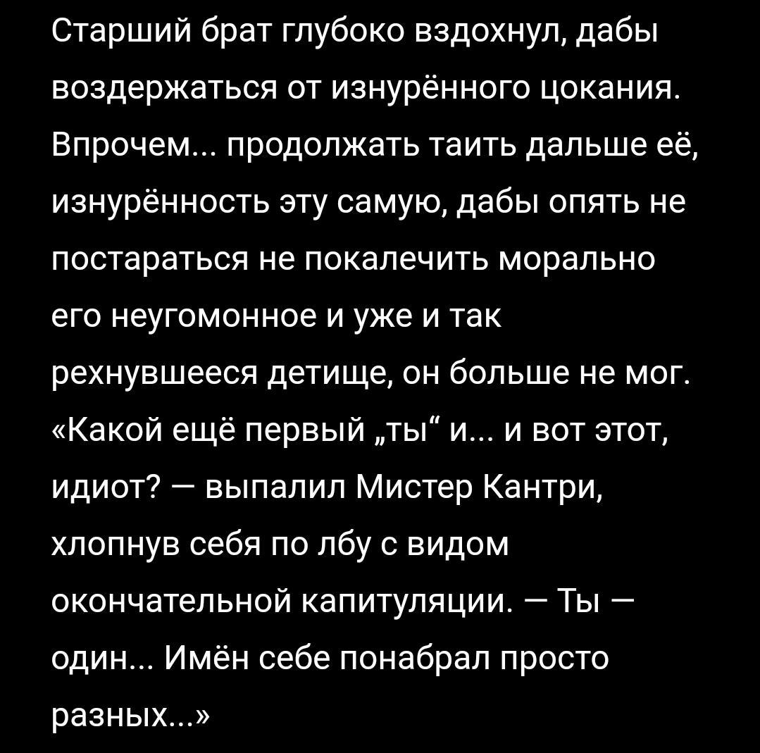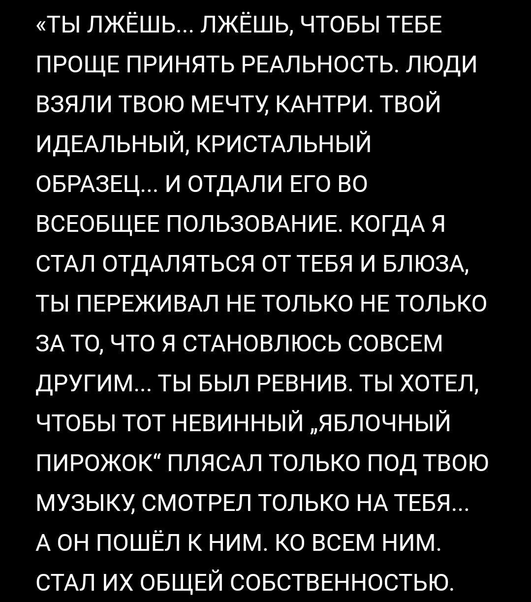 Впрочем, вчерашняя новая информация (хотя она, выходит, уже старая) помогла описать тот промежуток их конфликта, который оставался между последними словами Мистера Кантри о том, что это коллективное человеческое создало младшего братика таким невъебенно харизматичным жгучим брюнетом с кожной бледностью вурдалака, и до прихода Мистера Блюза, которому придётся всё то дерьмо, что устраивает эта вискарьчато-абсенточная парочка.