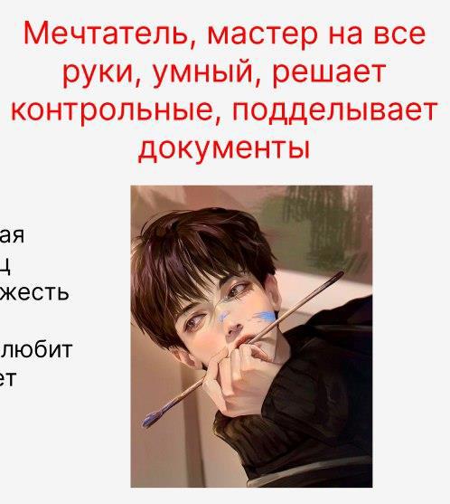 работать по приколу, потому что скучно было. Но на самом деле внутри него огромный внутренний мир, который он боится показывать из-за того, что боится стать обузой/ что от него откажутся и тд.