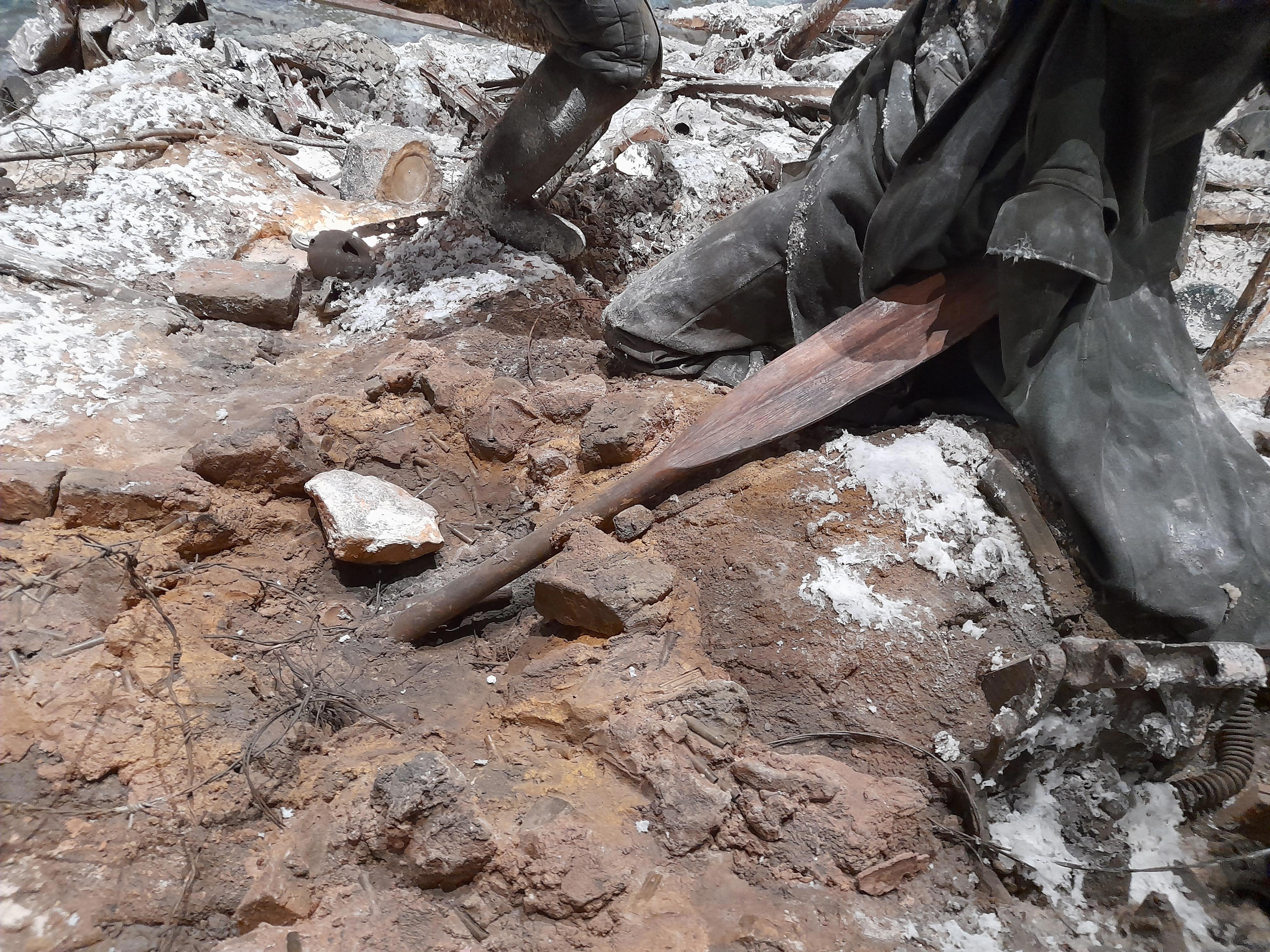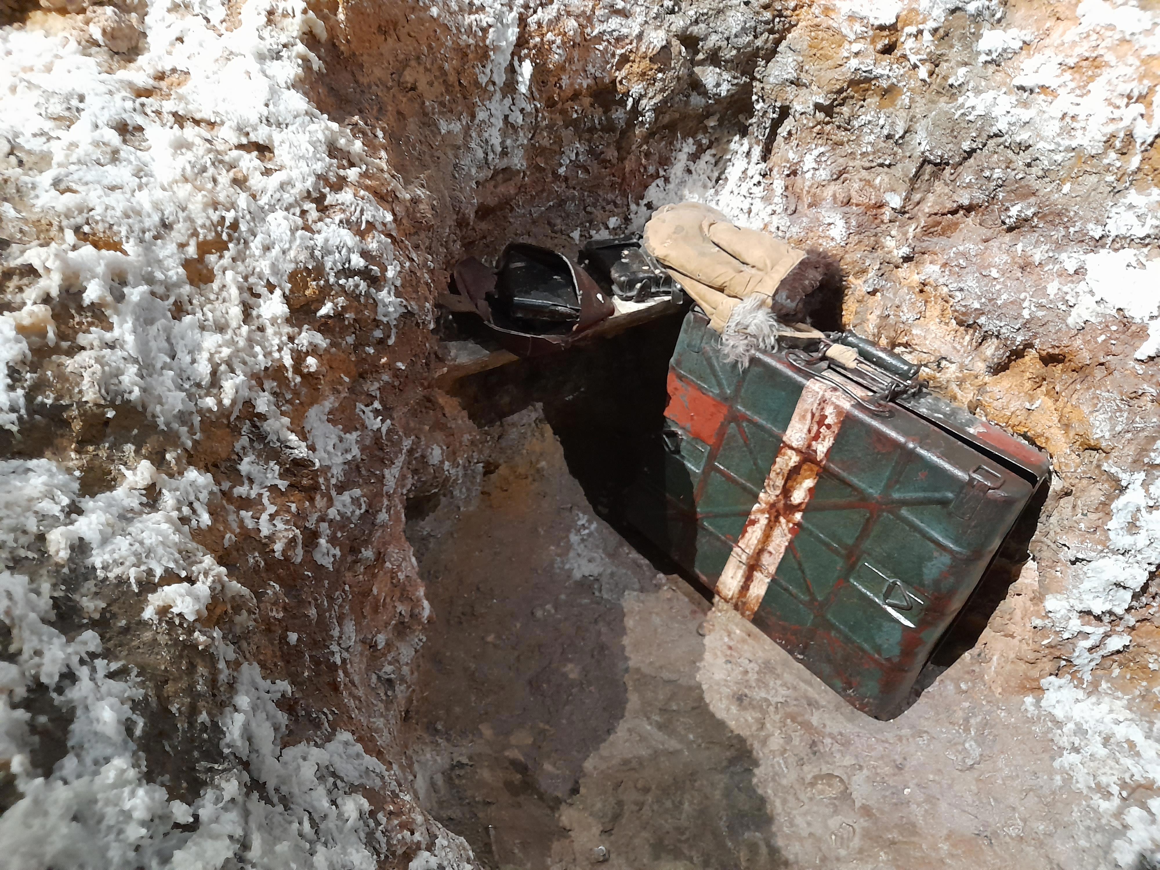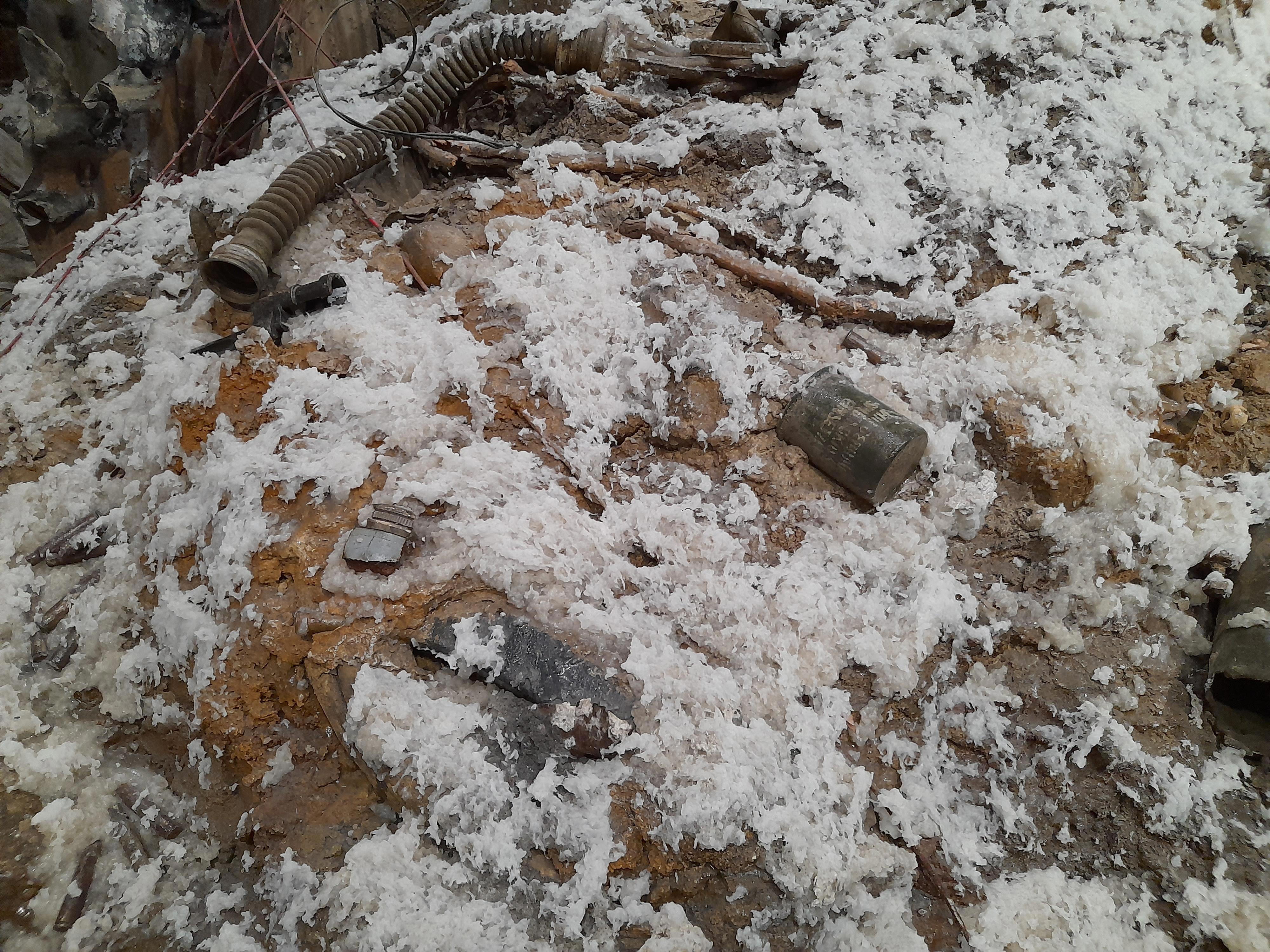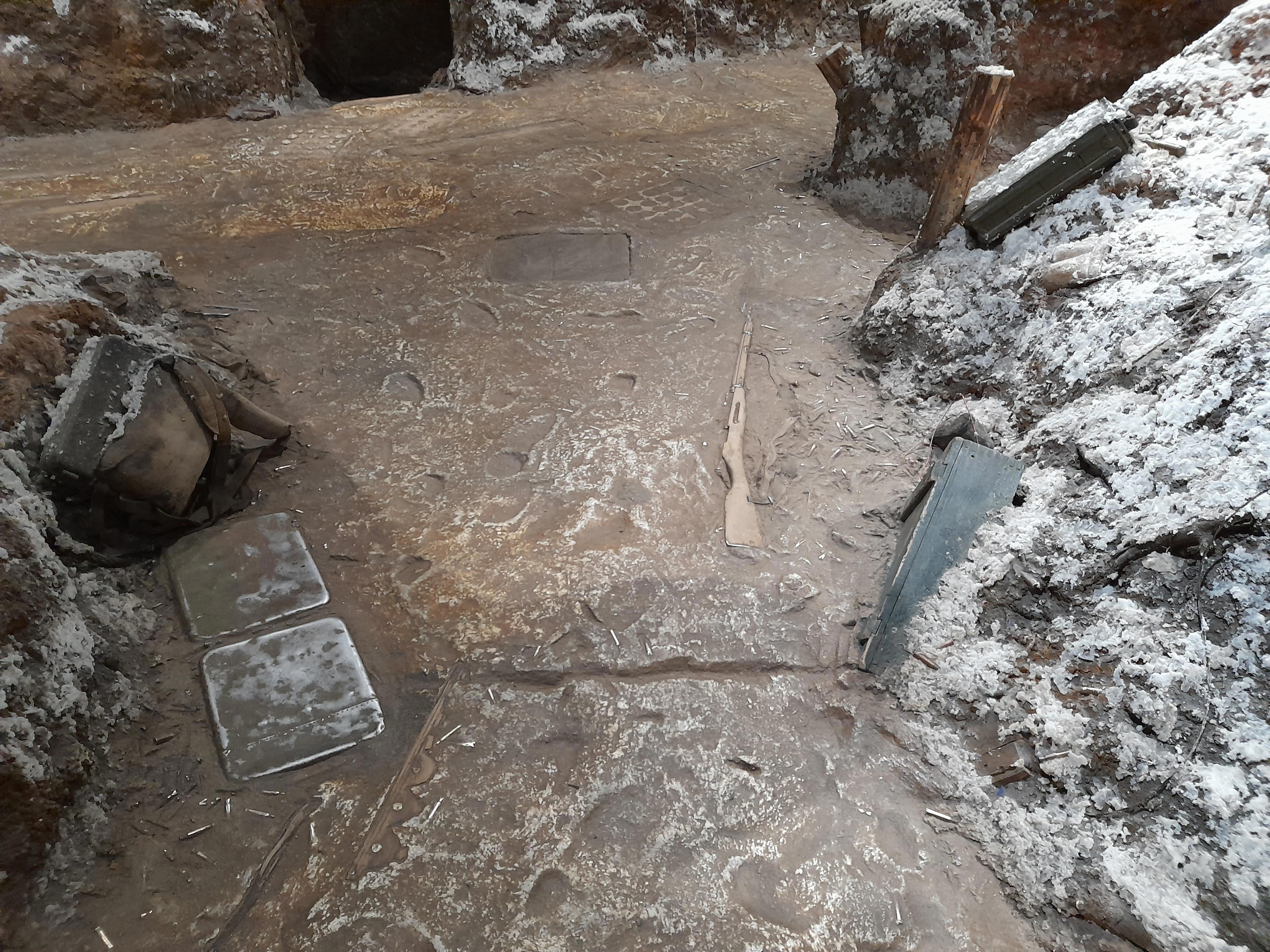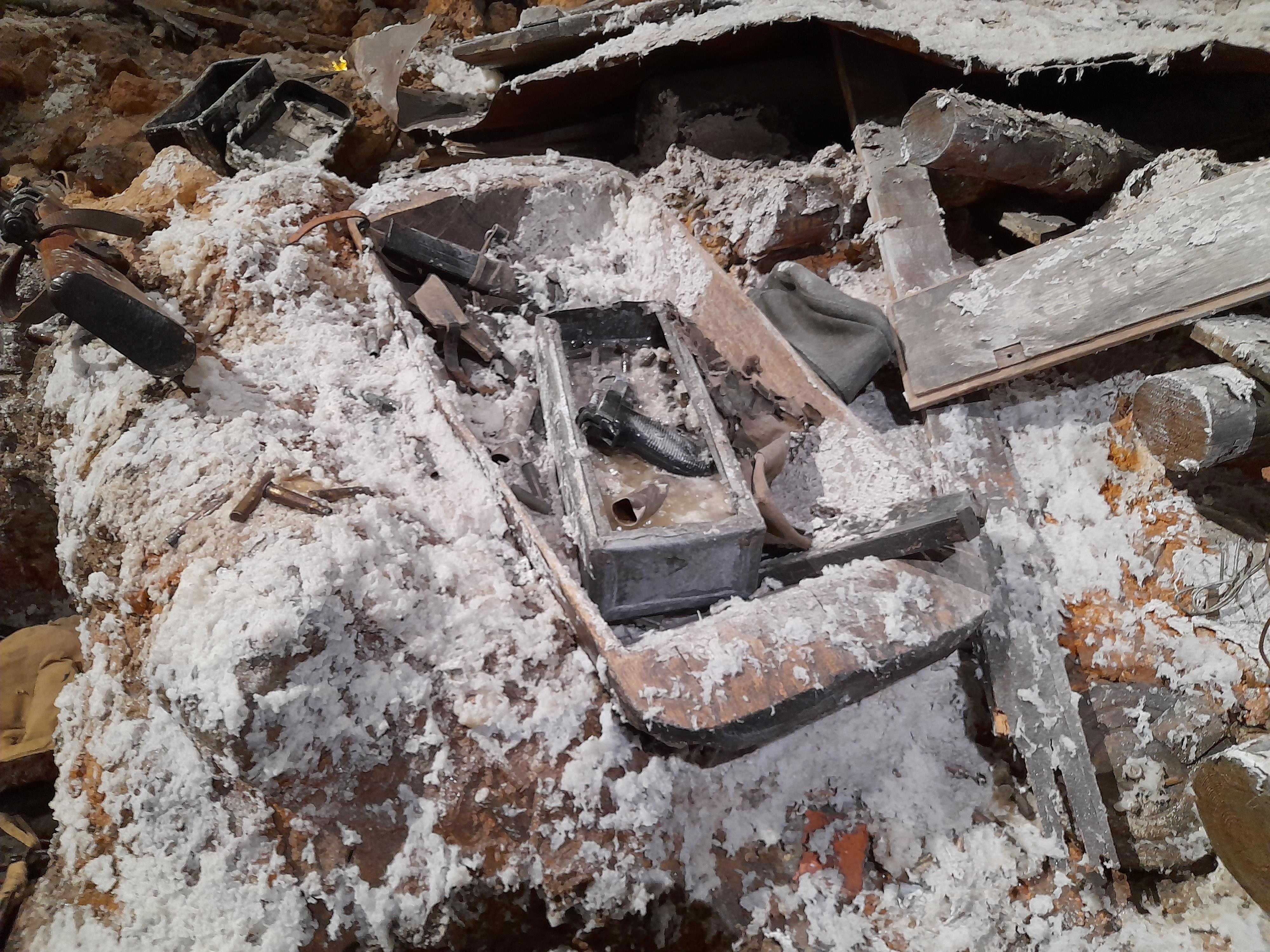 Деревенское корыто, использовавшееся как поддон - магазины, патронный ящик, вмерзщий пистолет.