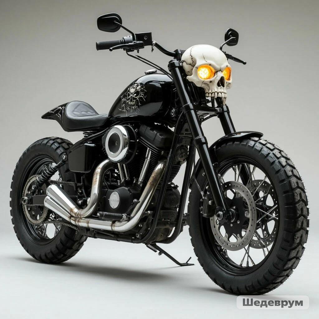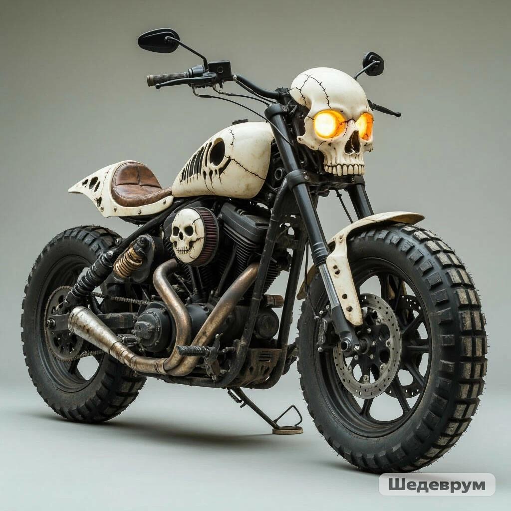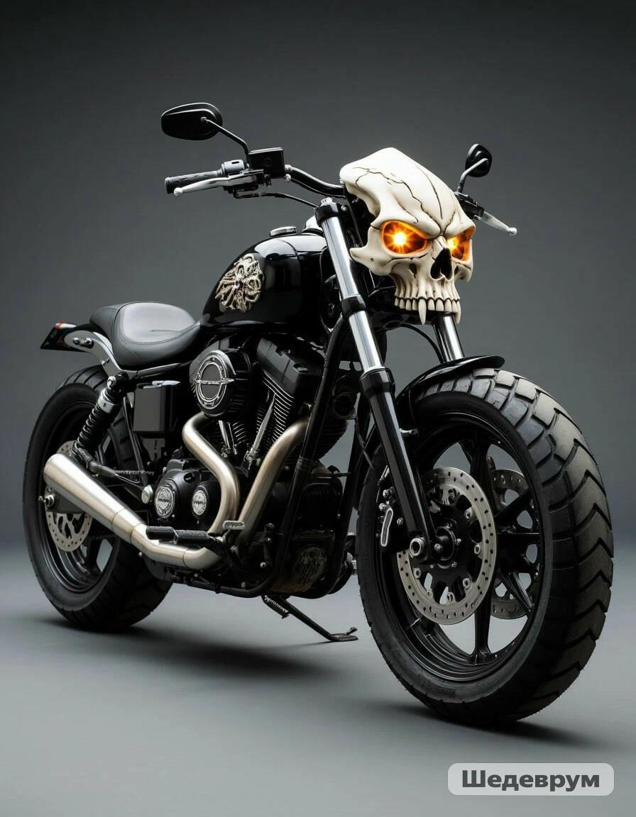 Здесь мотоцикл получился почти идеально, только вместо черепа обычная фара
