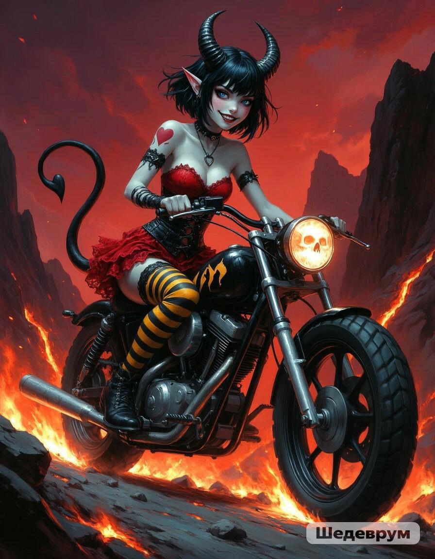 Точнее, сам мотоцикл шедеврум нарисовать может, а вот, посадить на него Юту - нет. Как только она на него садится, мотоцикл становится самым обыкновенным. Тогда как если рисовать мотоцикл отдельно, получается гораздо ближе к искомому запросу: