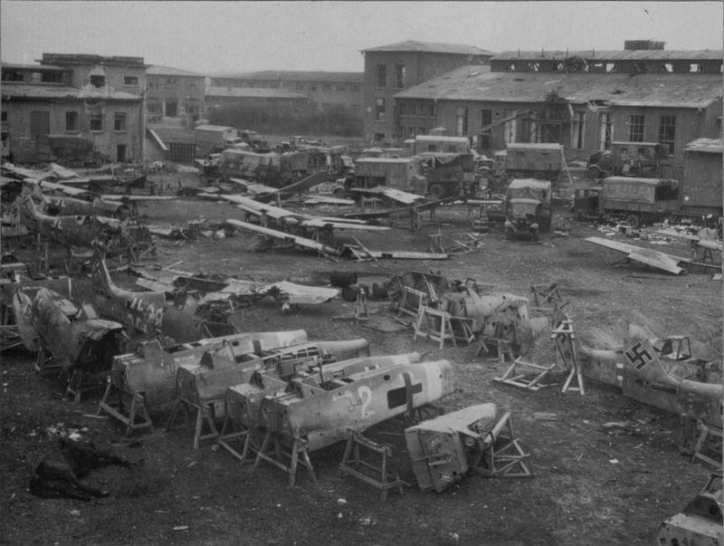 В отчете наших по трофеям. и вроде как этот завод у немцев не считался выпускающим самолеты. А тут как раз из битой техники собирали этаких Франкенштейнов - из нескольких трупов - один самолет годный. Полагаю, что запчасти новые тоже поставляли, но судя по всему - в основном шло то, что отлеталось. Другое дело, что разные части самолета имеют различную важность. И да, как толковали умные люди - самолет можно полностью восстановить, даже если от него пара шильдиков только осталось - вопрос в количестве потребных запчастей.