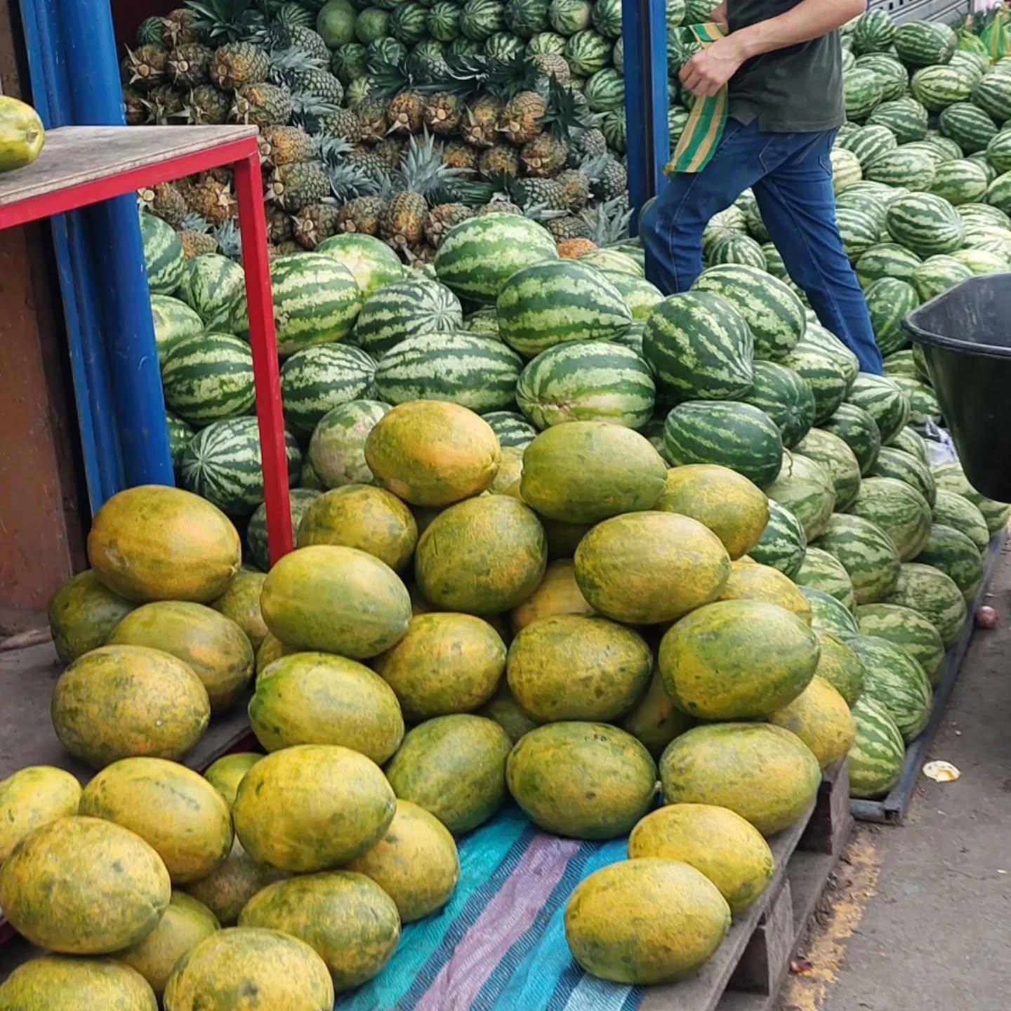 На переднем плане вовсе не дыни, а папайи. А вот ананасы неожиданно зеленые, которым еще зреть и зреть.