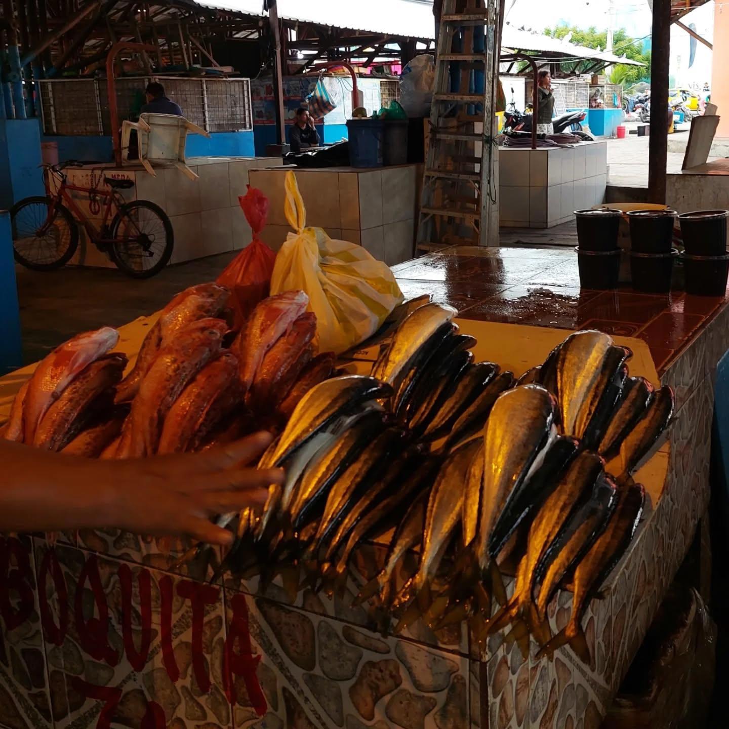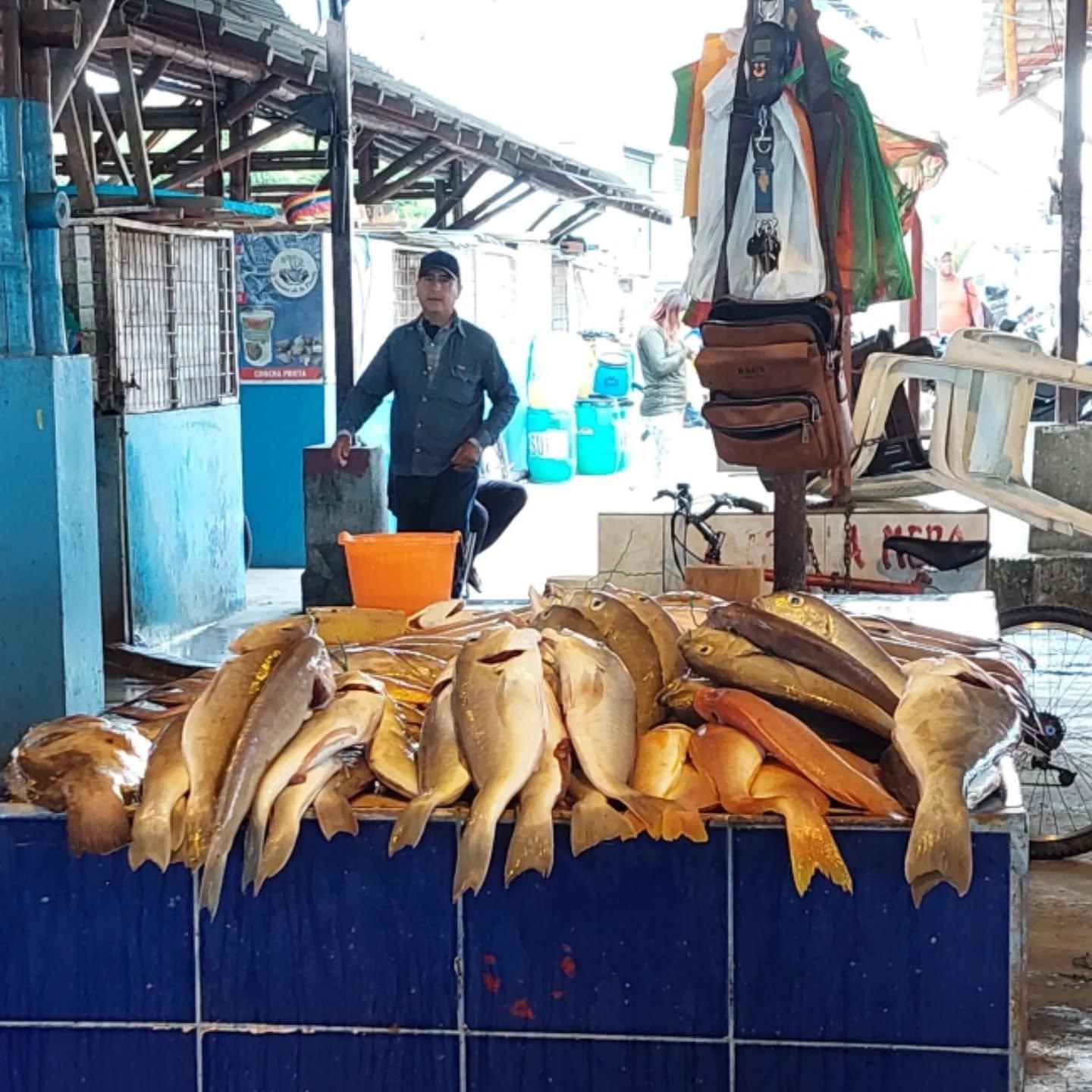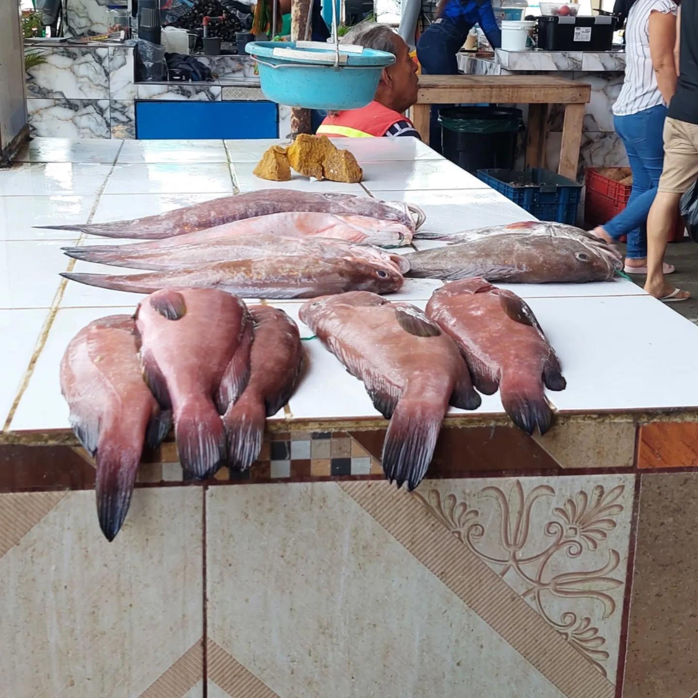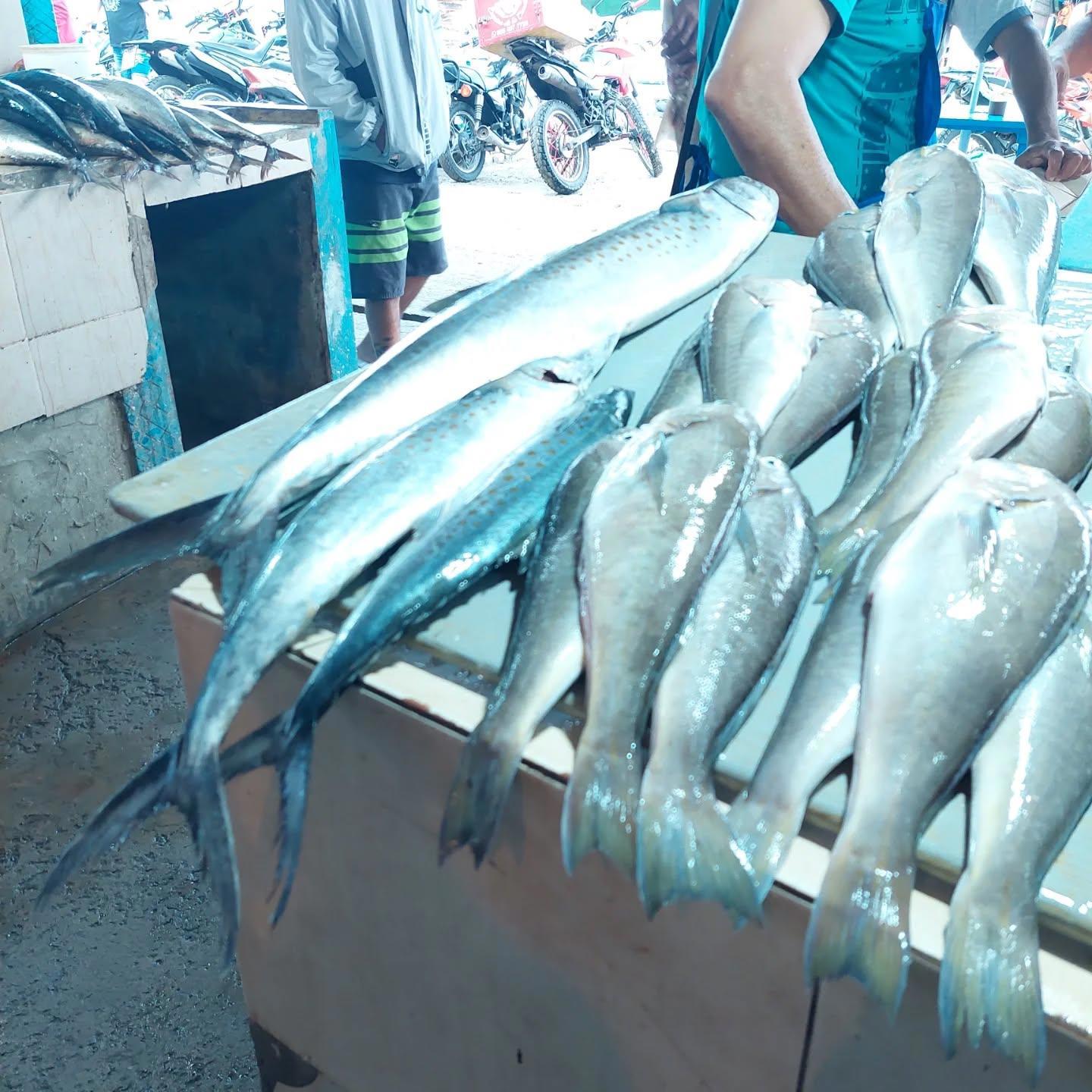 Морской окунь и кабайо (лошадь) она же скумбрия. Продавец показывает сколько стоит кучка.