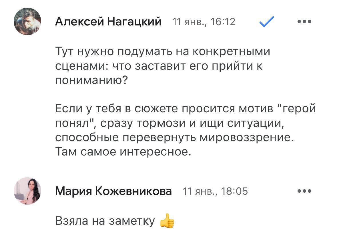 Мы с Марией продолжаем обучаться навыку создания сюжетов. Верней, Мария обучается, а я наставничаю. И вот мы столкнулись с общей проблемой многих: герой должен поменяться и осознать что-либо, а как это сделать — черт его знает.
