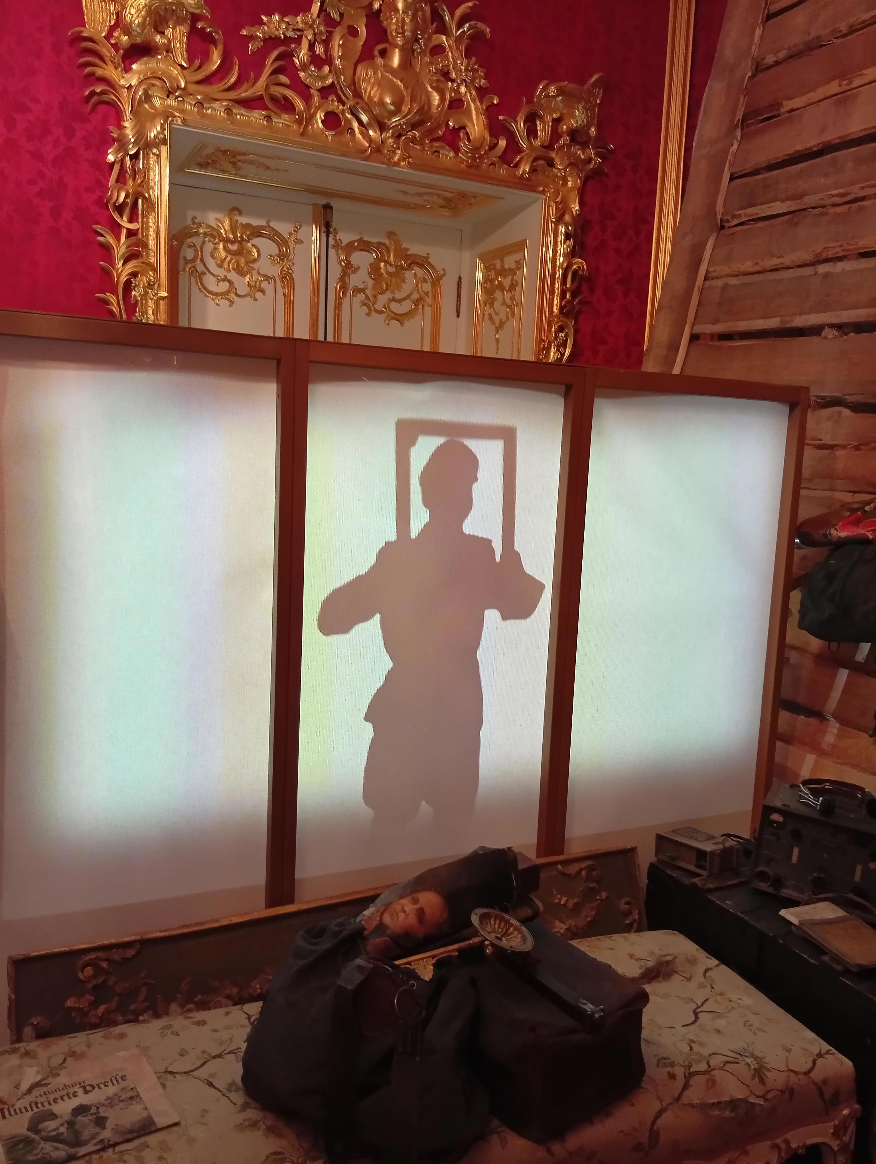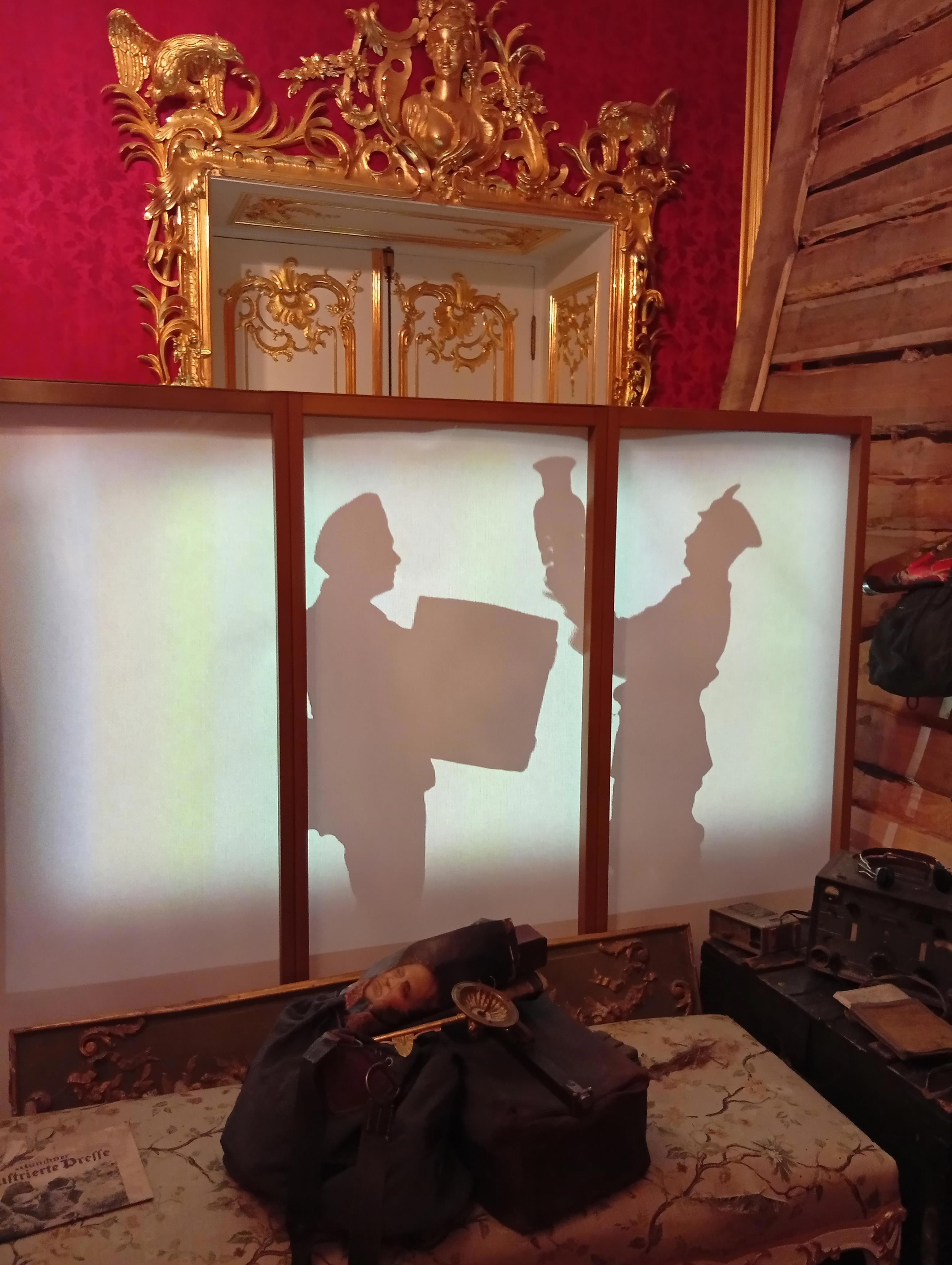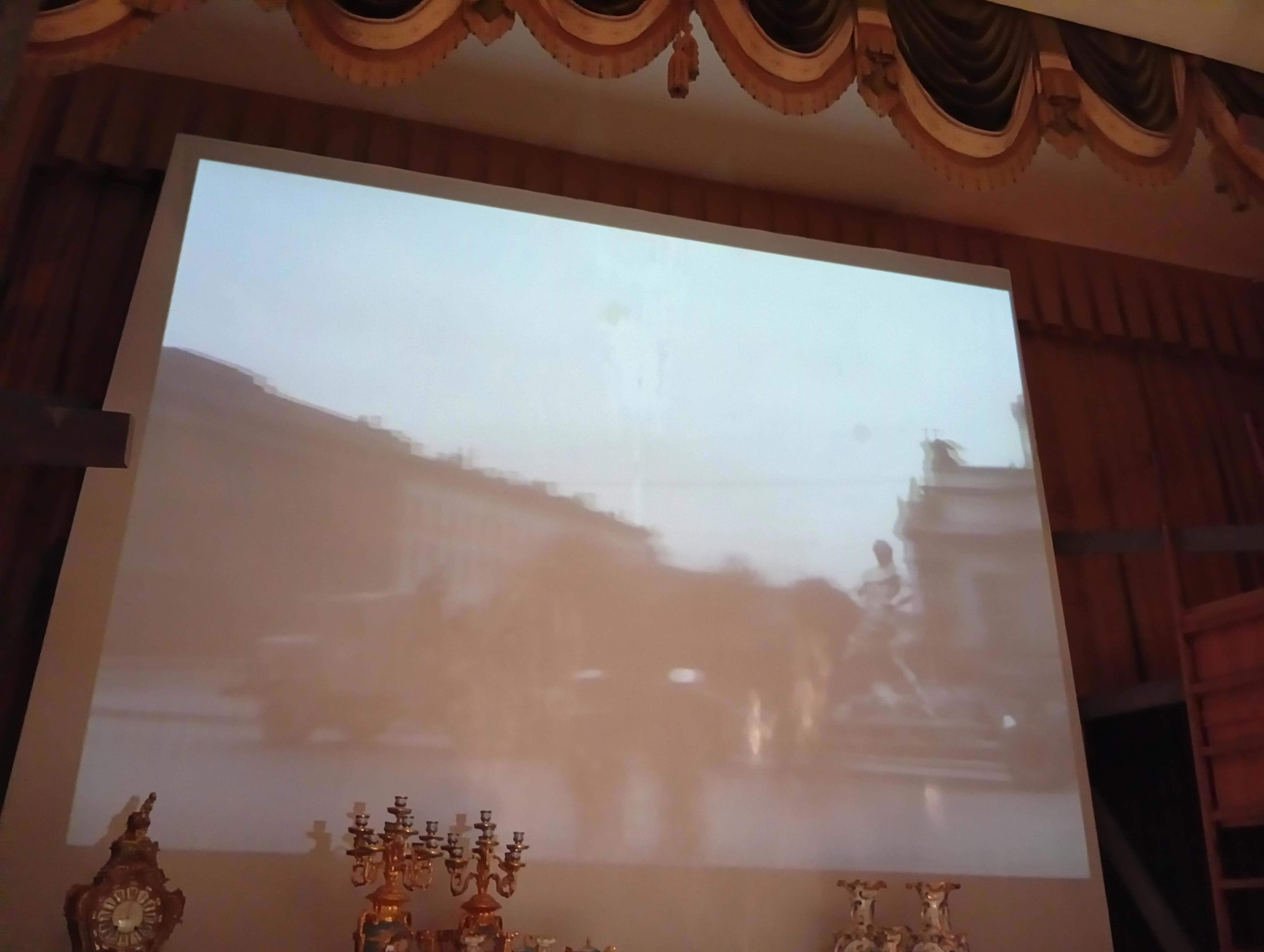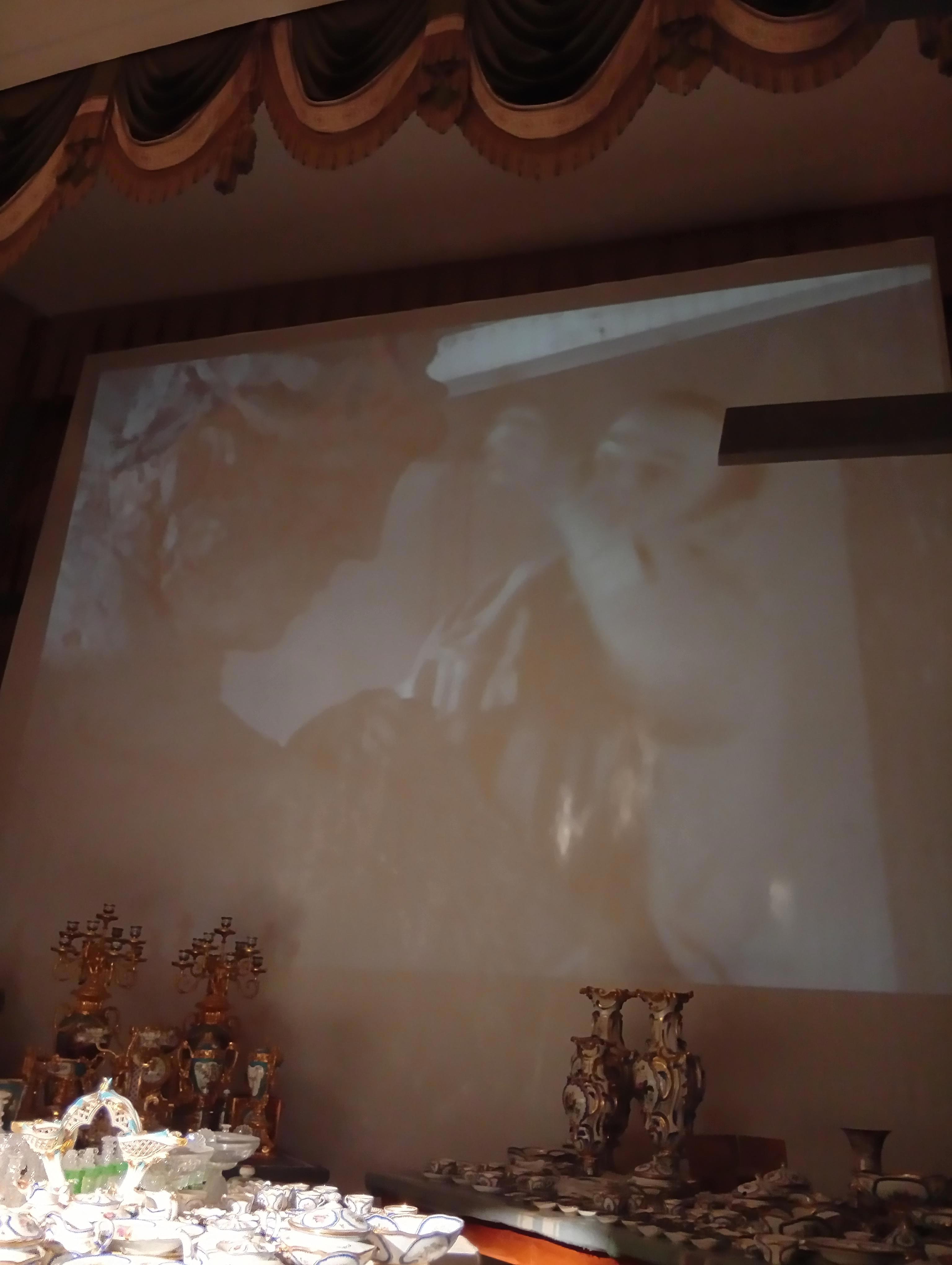 За ширмой дербанят дворец. Один из известных эпизодов — напившись, дорогие гости палили по потолку, сбивая лепнину, пытался его заловить чтобы сфотографировать, но оказалось слишком долго, забил.