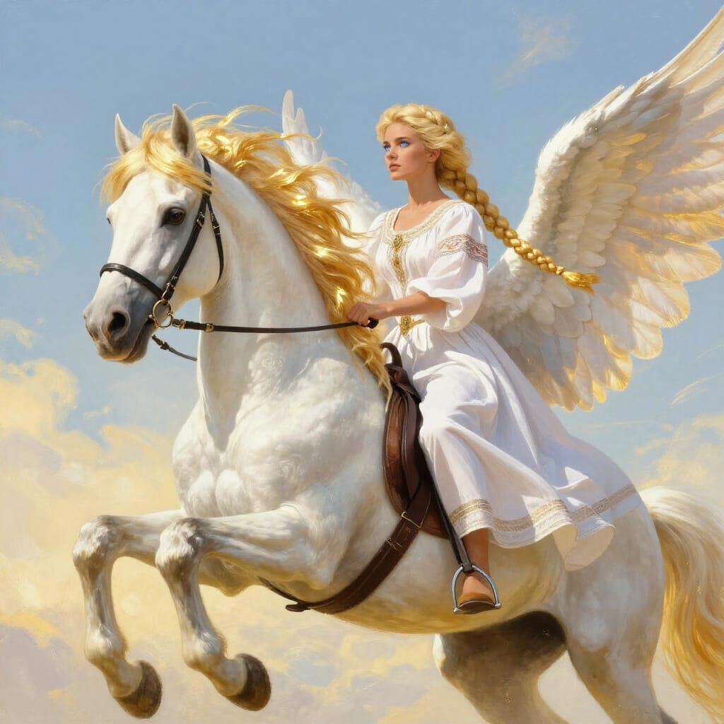 Поднялся, за Моривой ступаю, и тут вышли первые лучики солнышка. Гляжу — батюшки! Исчезла страшная дева, а вместо неё явилась краса неописуемая. С золотистой косою, с глазами яркими голубыми, стати княжьей, в платье белом, солнцами расшитом. А лошадь под нею белоснежная, с крыльями лебяжьими и гривой золотой.