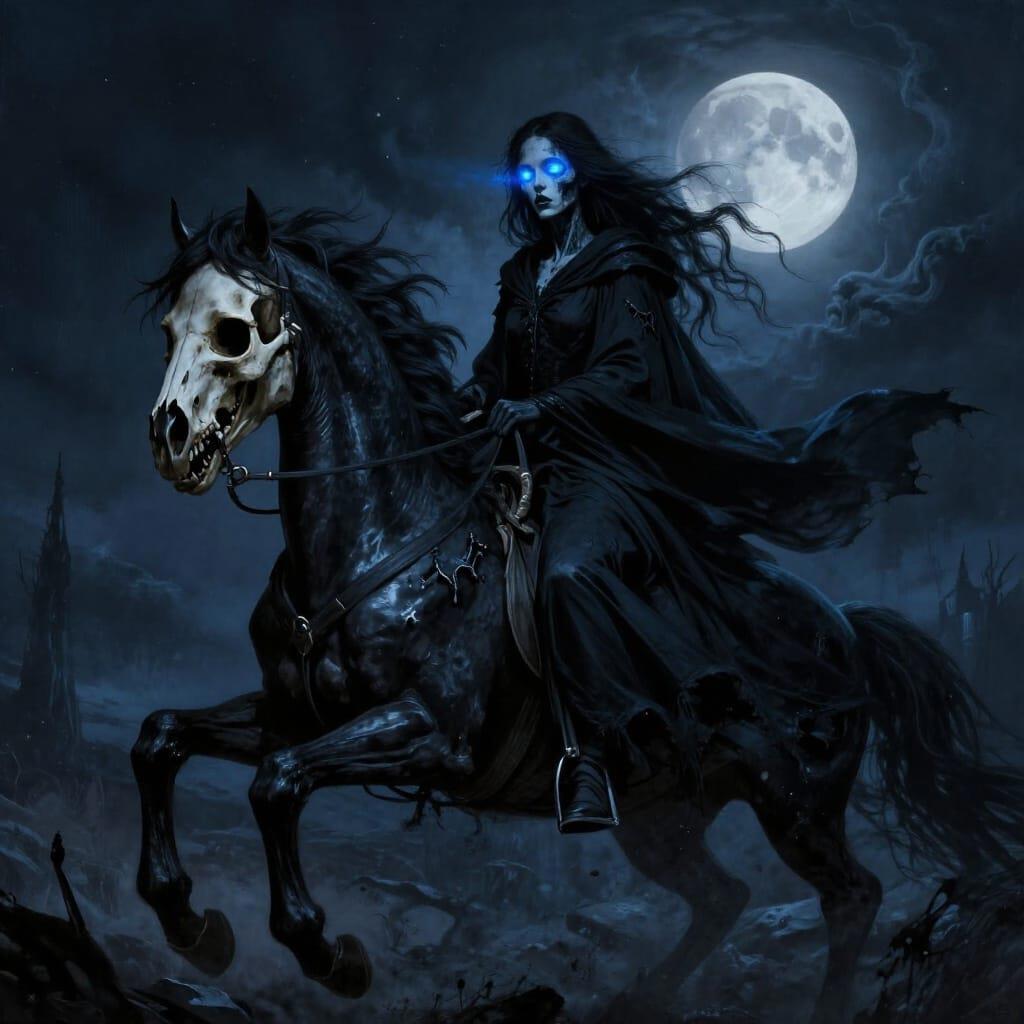 Лошадь у неё — кобыла Тёмнова, сама чернее ночи, грива да хвост шелками стелются, а морда до кости стёрта, в глазах огни разгорелись. У самой Моривы половина лица девичья, красивая, а другая — череп, а в глазнице пламя голубое, одежды на ней — лохмотья какие-то чёрные.