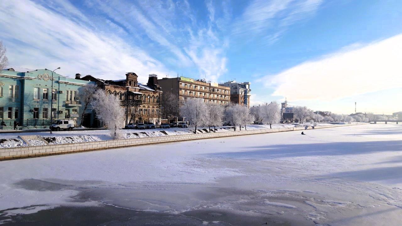 2) Стоит чудесная солнечная погода, хотя температура опускается до минус 15-20 градусов, для нас это холодно. Город покрыт снегом, что радует пешеходов, но не водителей.