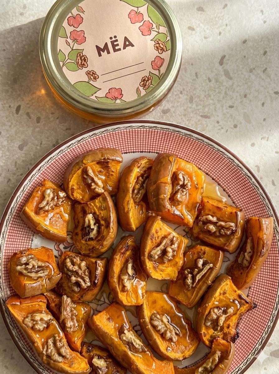 — Действительно, очень красиво, а какой аромат! Сейчас тыковка стала мягче, и нам нужно воткнуть в середину каждого кусочка по половинке грецкого ореха. Здесь вообще всё индивидуально — можно экспериментировать на свой вкус, потому что это блюдо не испортить. А сверху остаётся полить его мёдом и насладиться этим чудесным вкусом. Попробуй!
