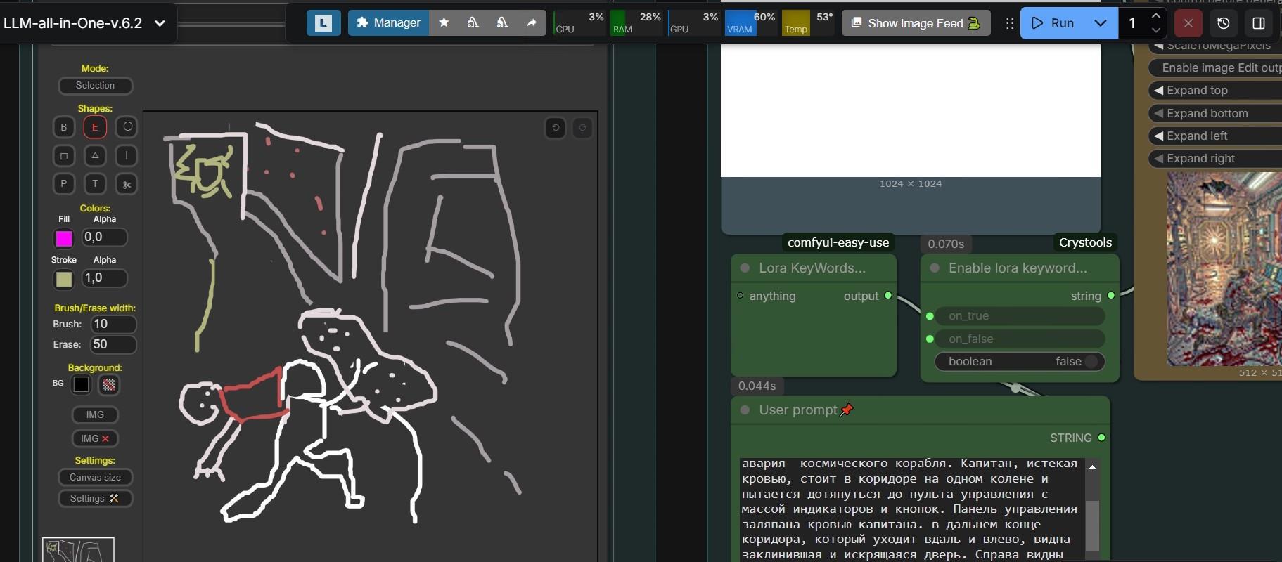 Казалось бы - обычный научно-фантастический арт - любые нейросети могут так нарисовать. Но не все так просто :) Здесь мы имеем результат прорисовки по скетчу, который нарисован на отшибись за пару секунд и собственно и является калякой-малякой, но тем не менее нейросеть подхватила общий сюжет и взаиморасположение объектов. Основной командой была фраза "Convert sketch to SF art. Stick to the natural proportions of the objects and take only their mutual positioning from the sketch." Вот скриншот кусочка воркфлоу.