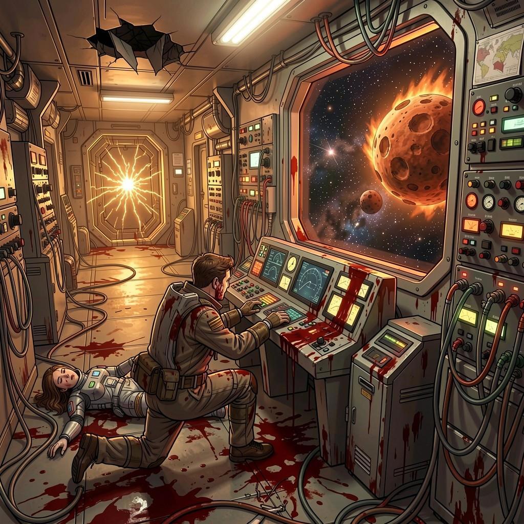 авария космического корабля. Капитан, истекая кровью, стоит в коридоре на одном колене и пытается дотянуться до пульта управления с массой индикаторов и кнопок. Панель управления заляпана кровью капитана. в дальнем конце коридора, который уходит вдаль и влево, видна заклинившая и искрящаяся дверь. Справа видны стойки с какими-то приборами соединёнными жгутами кабелей с массой индикаторов. На правой стена коридора расположен огромный квадратный иллюминатор, в котором виден огненный астероид и звезды. Слева от капитана на полу лежит мертвая девушка в скафандре из команды корабля. Все вокруг в крови. На потолке моргает аварийное освещение. на полу части отломившегося потолка и искрящиеся провода.