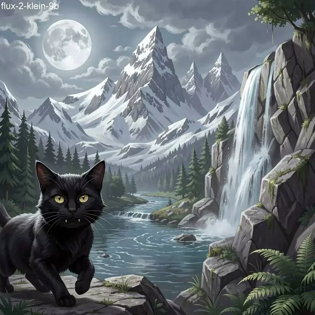 Тут я попросил нейросеть нарисовать черного кота, который крадется слева, водопад с огромными камнями справа, заснеженные горы вдали и речку в центре с вечно зелеными деревьями по берегам и вот что получилось