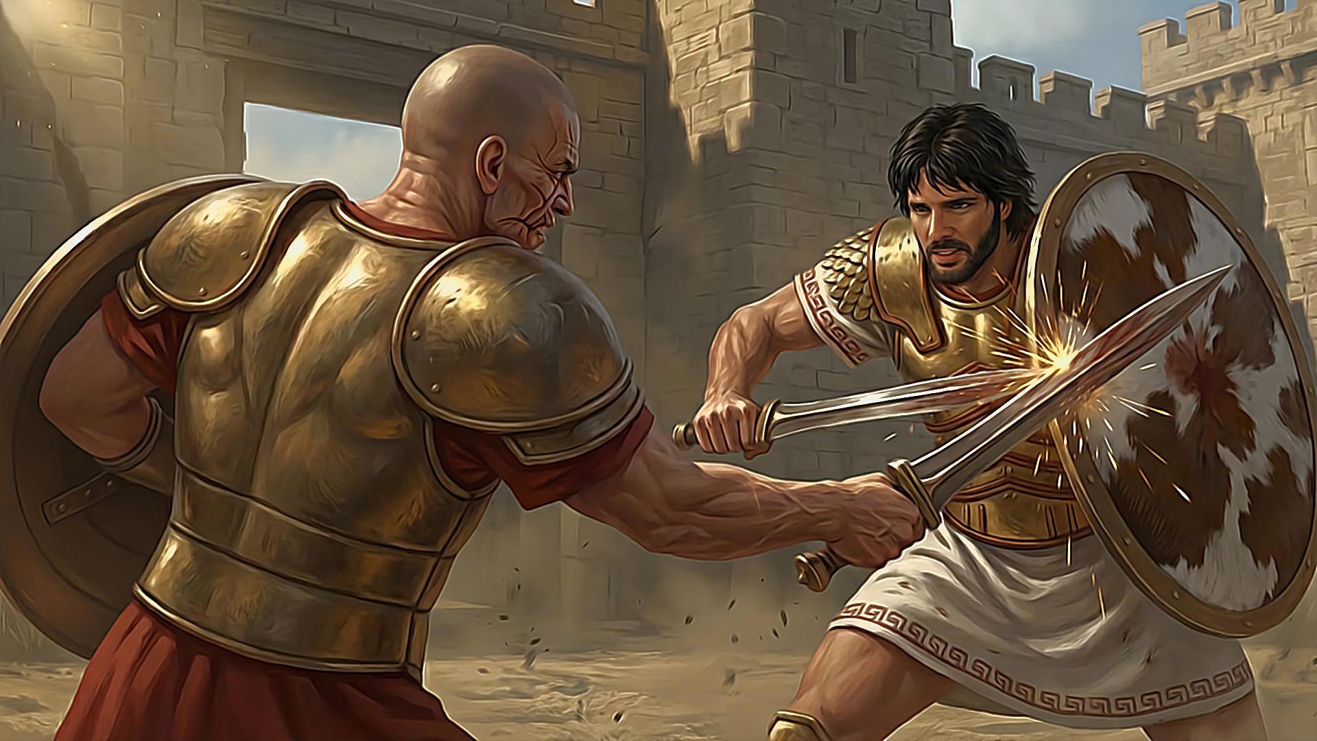 Сломал. Ахилл отпрыгнул, отбросил деревяшку, выхватил меч. Снова на равных.