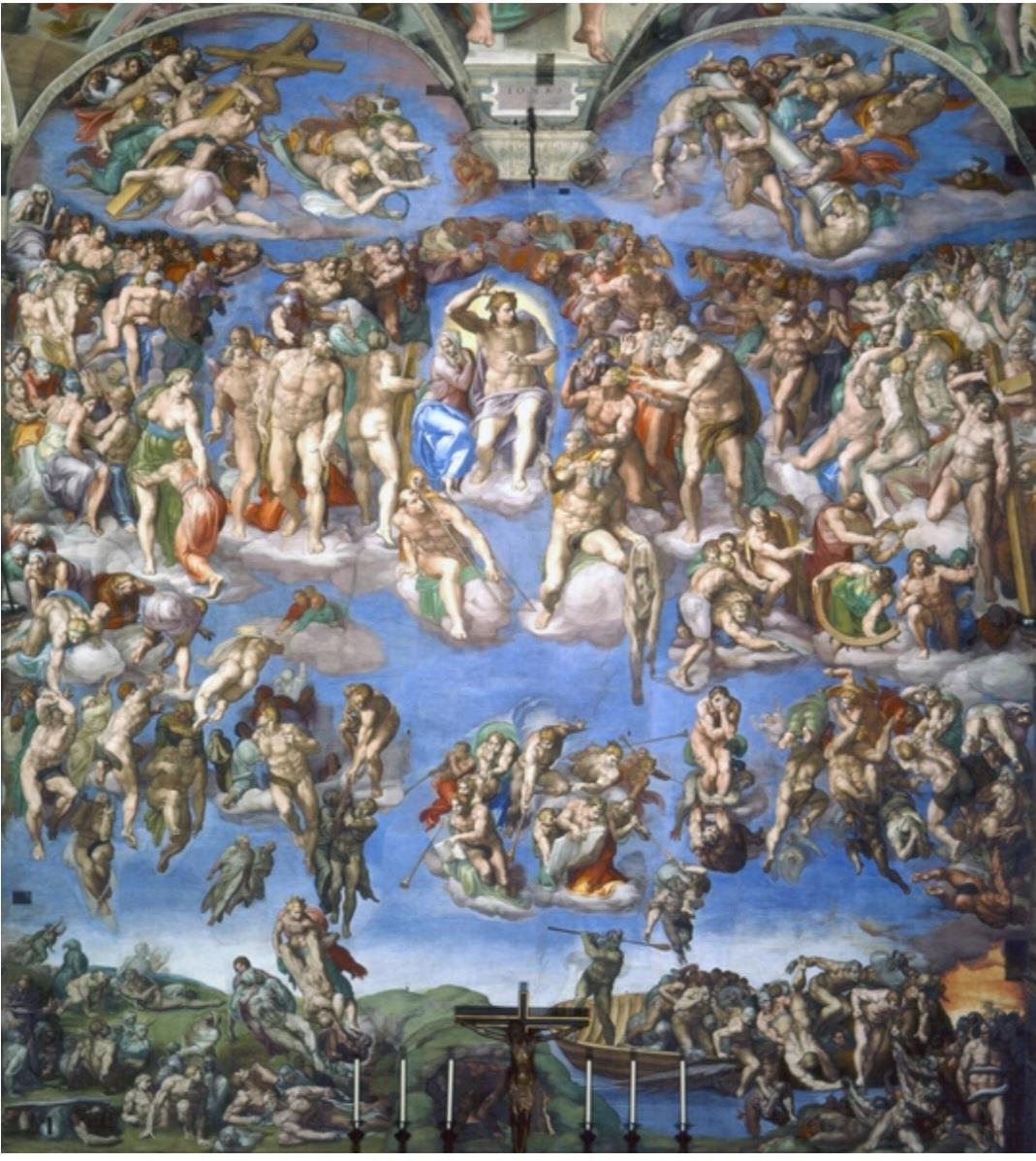 Представляете? Ни слова, ни упоминания! Вот о ней немного из Вики: Масштабная фреска занимает всю стену позади алтаря Сикстинской капеллы. Темой её стало второе пришествие Христа и апокалипсис. «Страшный суд» считается произведением, завершившим в искусстве эпоху Возрождения, которой сам Микеланджело отдал дань в росписи потолка и сводов Сикстинской капеллы, и открывшим новый период разочарования в философии антропоцентрического гуманизма.