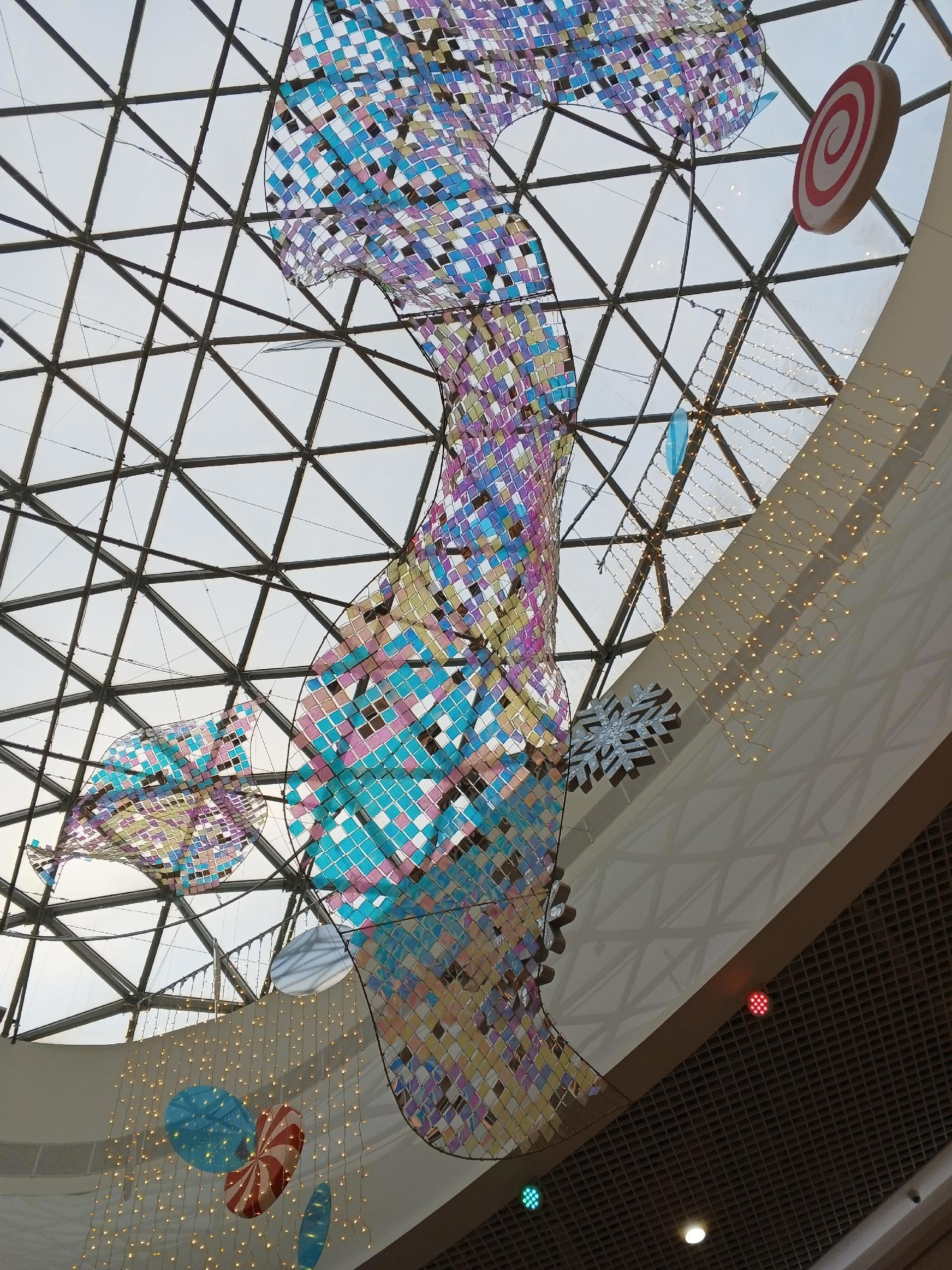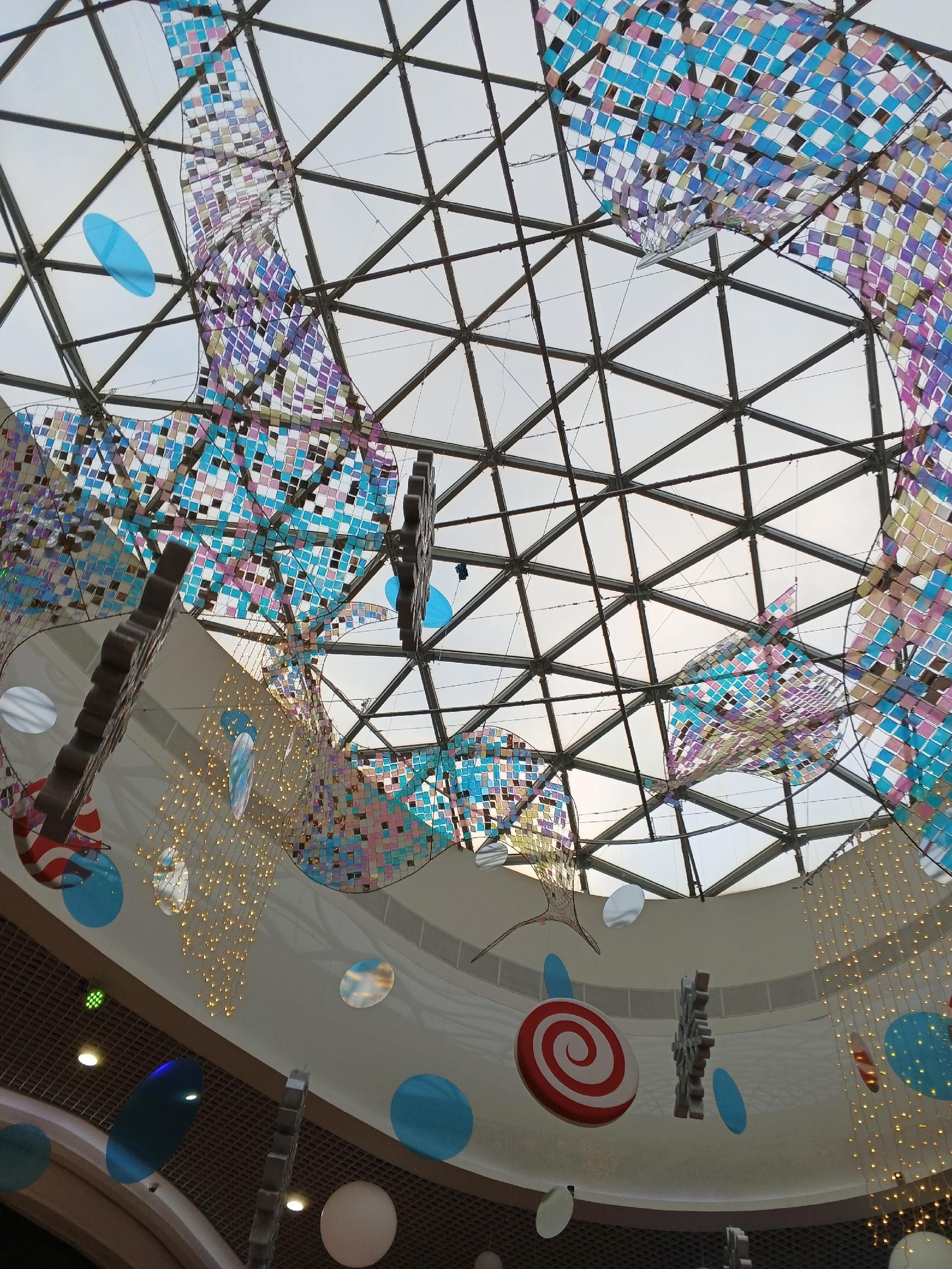 Итак, сперва поднимаемся на эскалаторе на второй этаж. Над головой ещё один световой плафон. И под реальными небесами над головой плывут рукотворные облака. И из этих облаков струятся гирлянды дождя, круглые ледяные капли и снежинки.