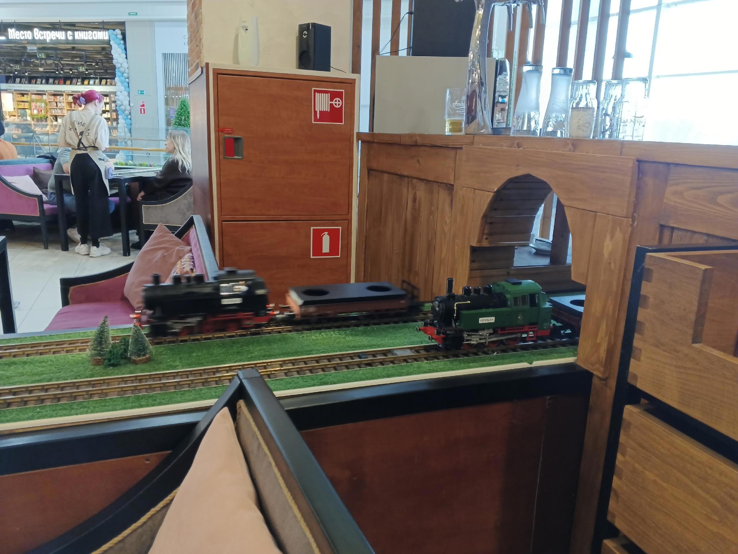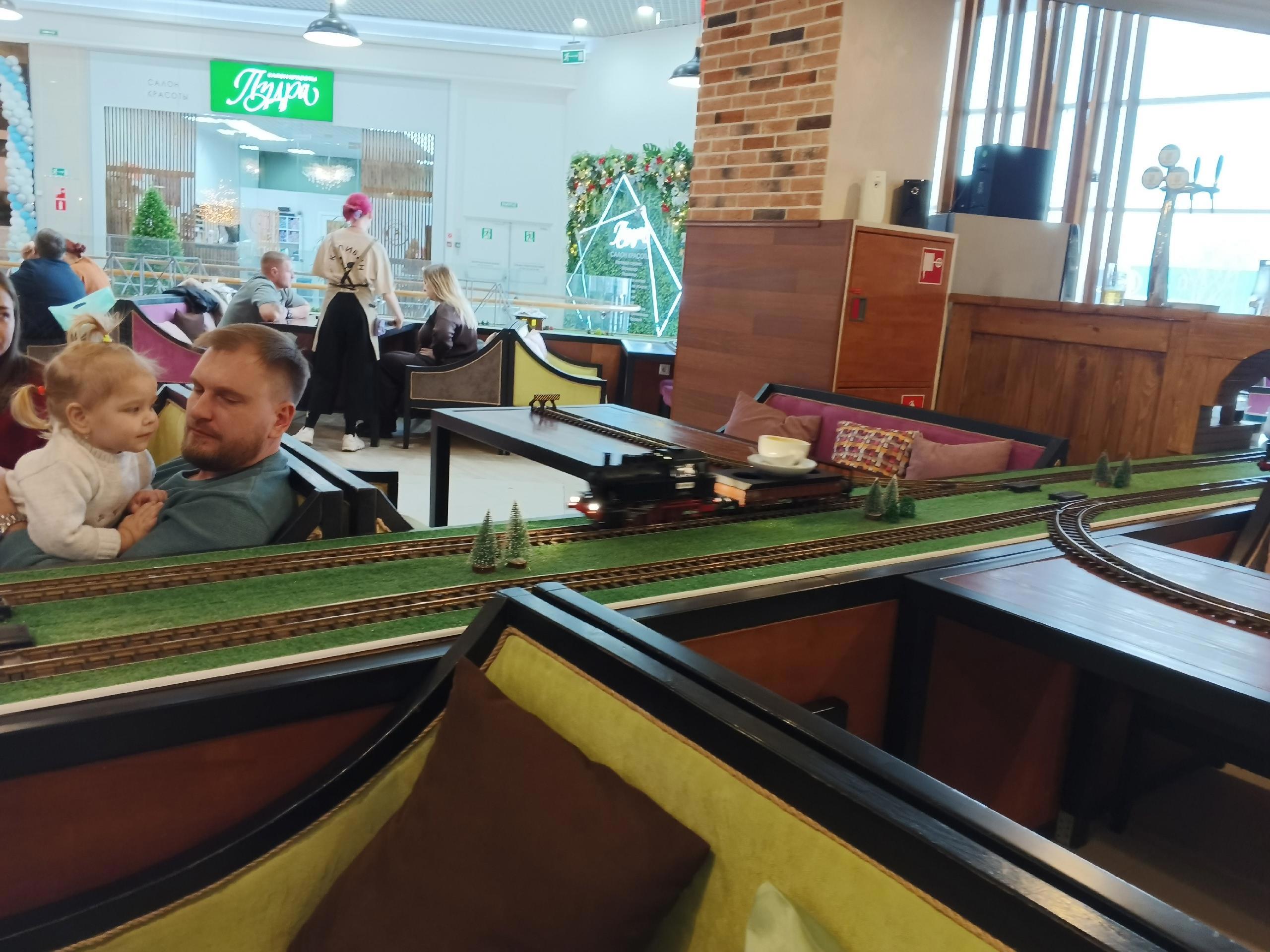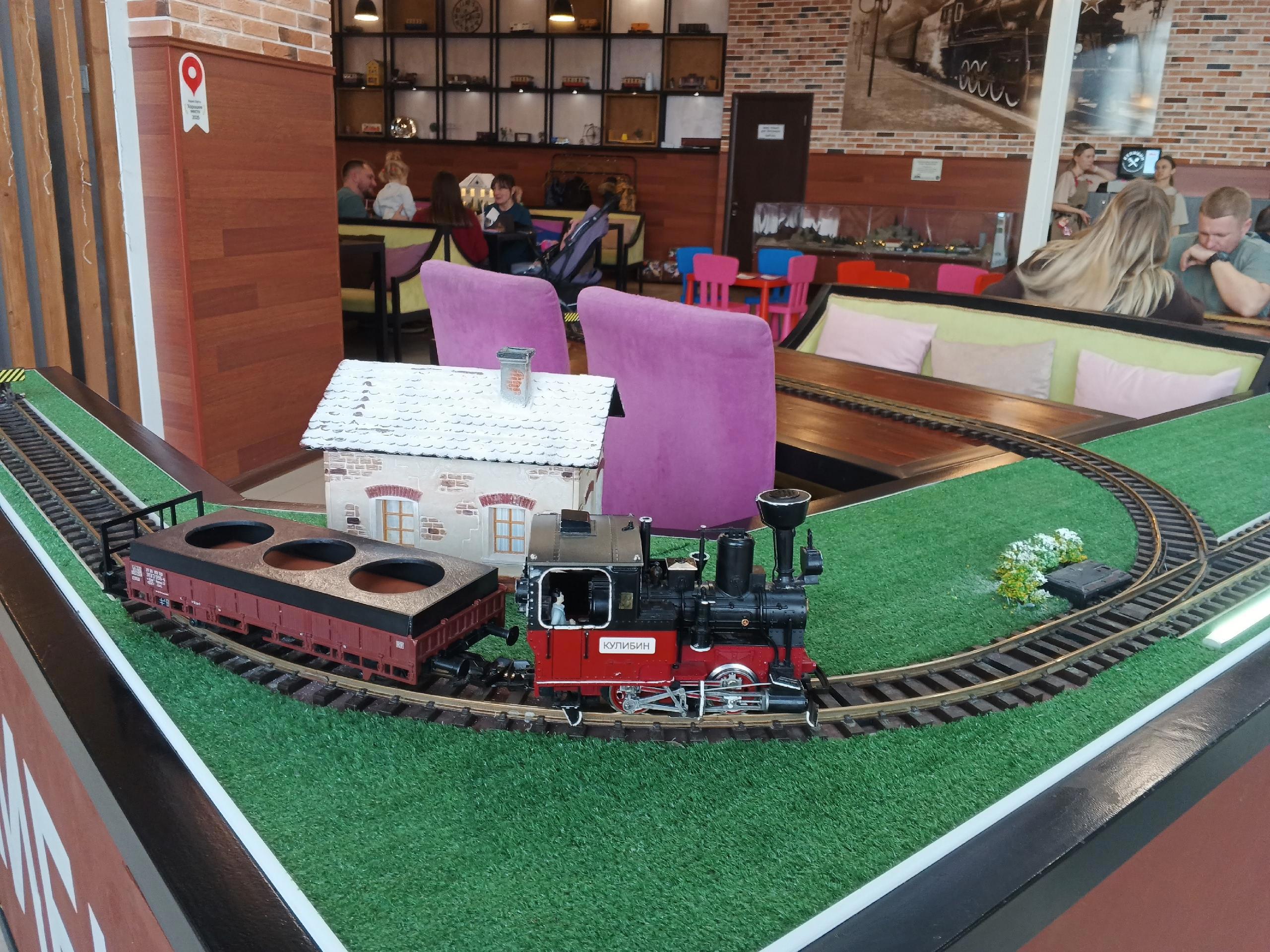 Нас встречают приятные улыбчивые девушки и столы к которым проложены рельсы настоящей железной дороги. Да-да, настоящей, хоть и игрушечной. К каждому столику подведены рельсы и заказы доставляет маленький паровозик с вагончиками.