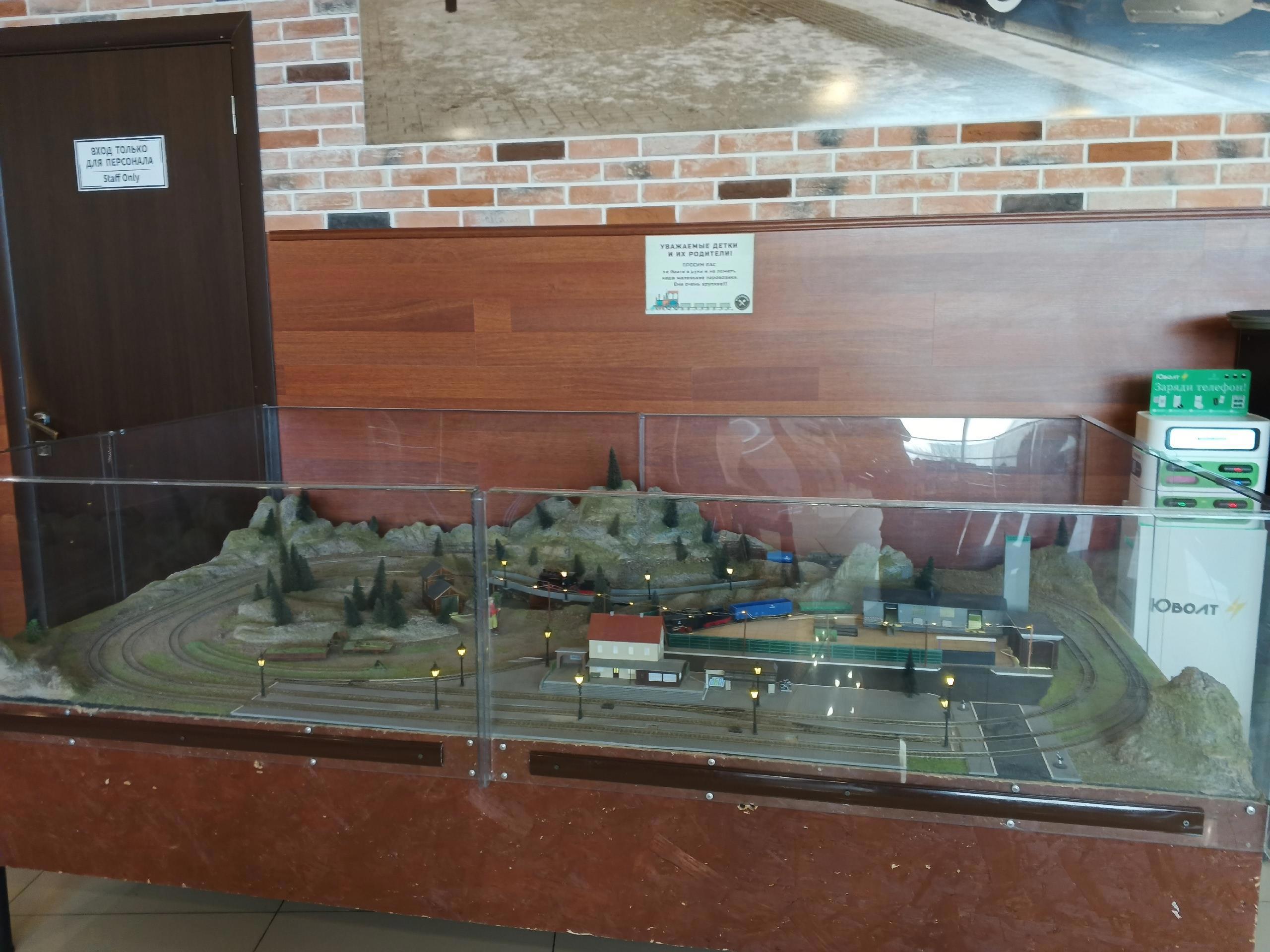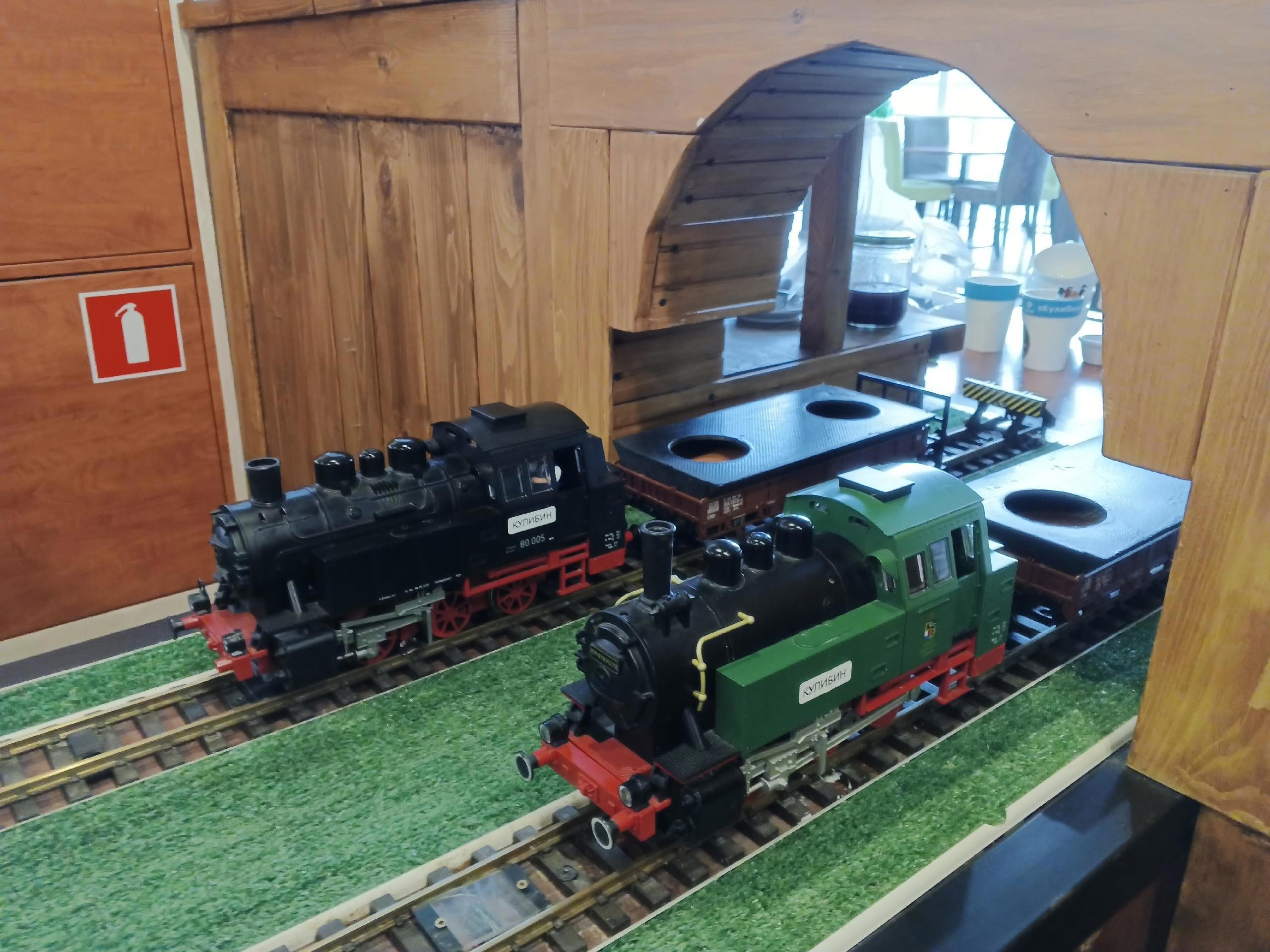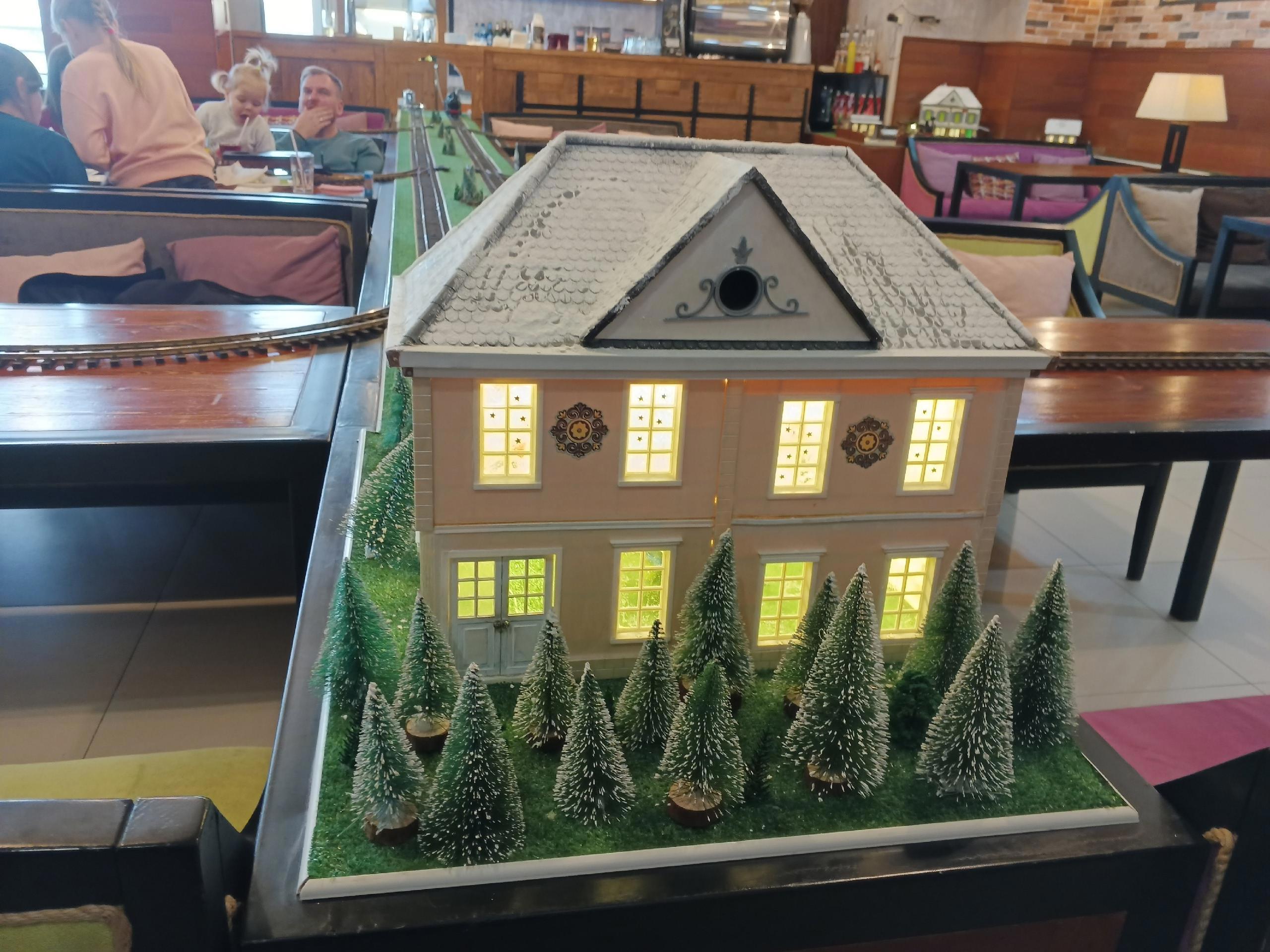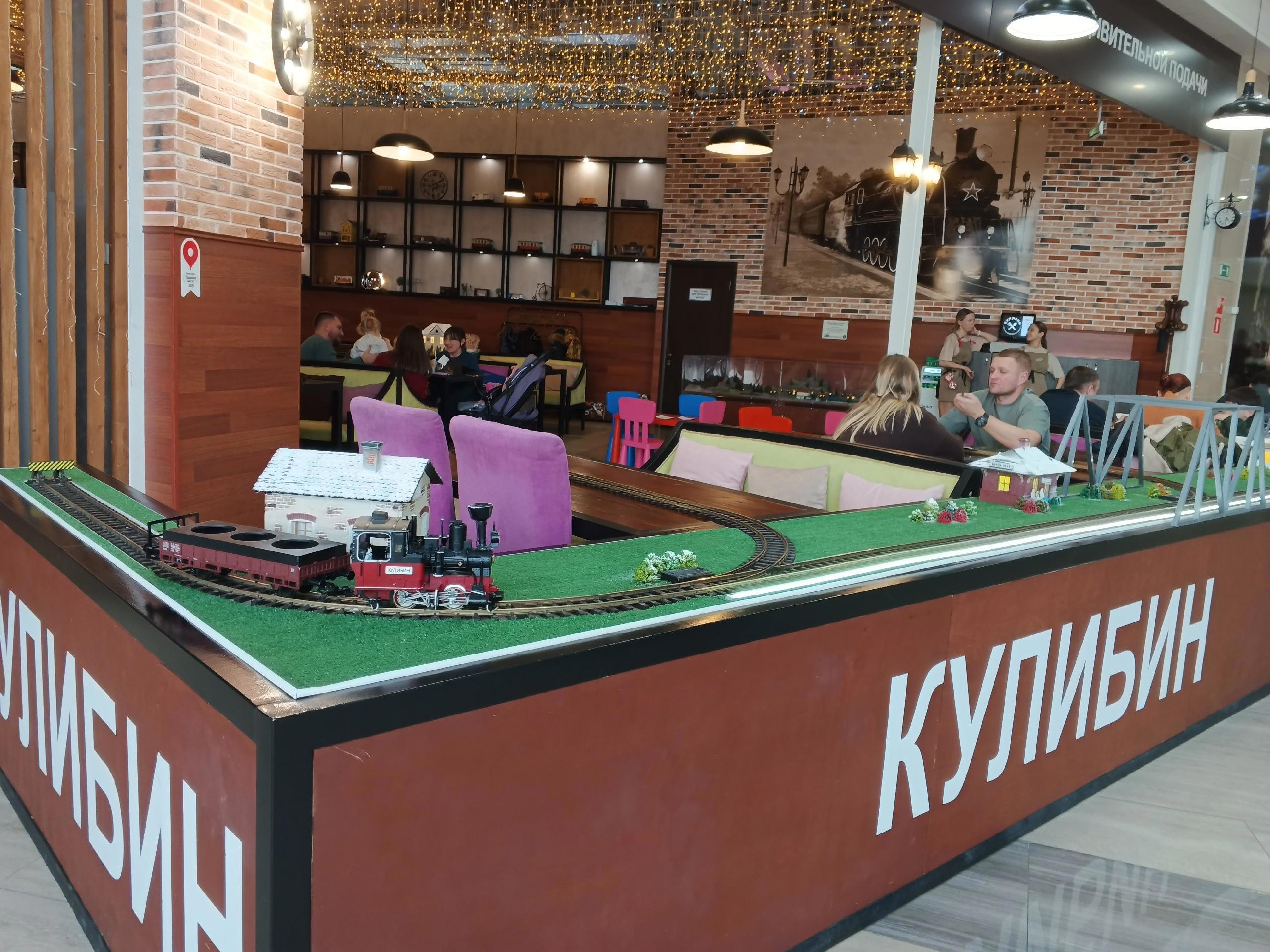 Нас встречают приятные улыбчивые девушки и столы к которым проложены рельсы настоящей железной дороги. Да-да, настоящей, хоть и игрушечной. К каждому столику подведены рельсы и заказы доставляет маленький паровозик с вагончиками.