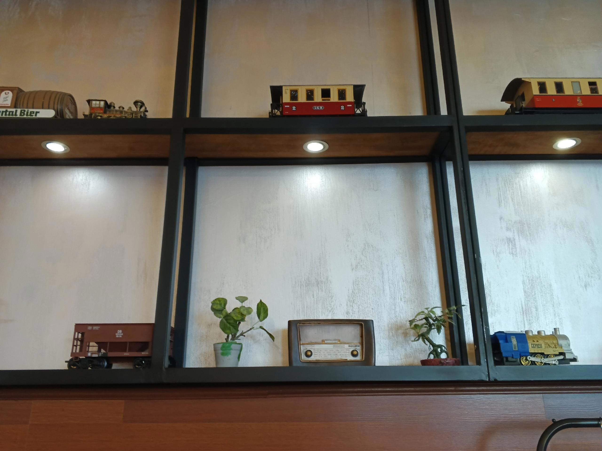 А на стене макеты паровозов, вагонов и винтажные вещи. Фото Галины Малышевой.