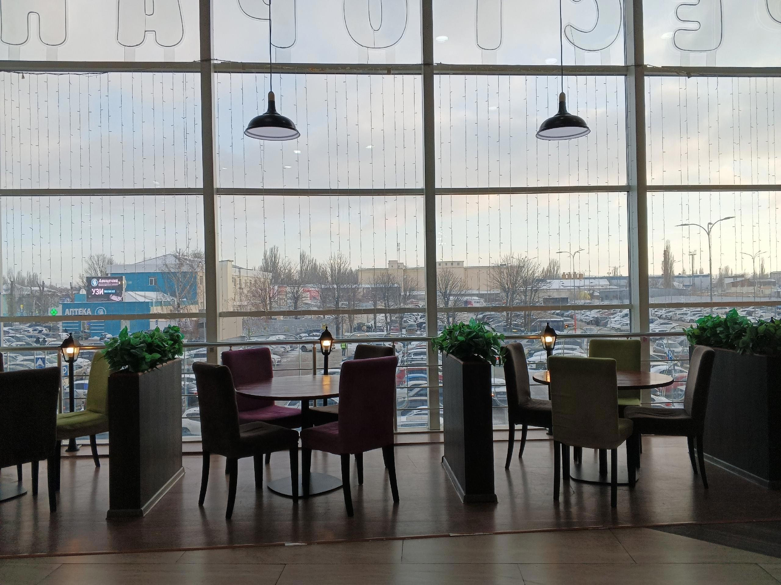 Напротив эскалатора мы видим огромное панорамное окно. Окно во всю стену. Рядом столики. Можно заказать в ресторане кофе или чай и сидеть возле окна наблюдая за окружающим нас миром.