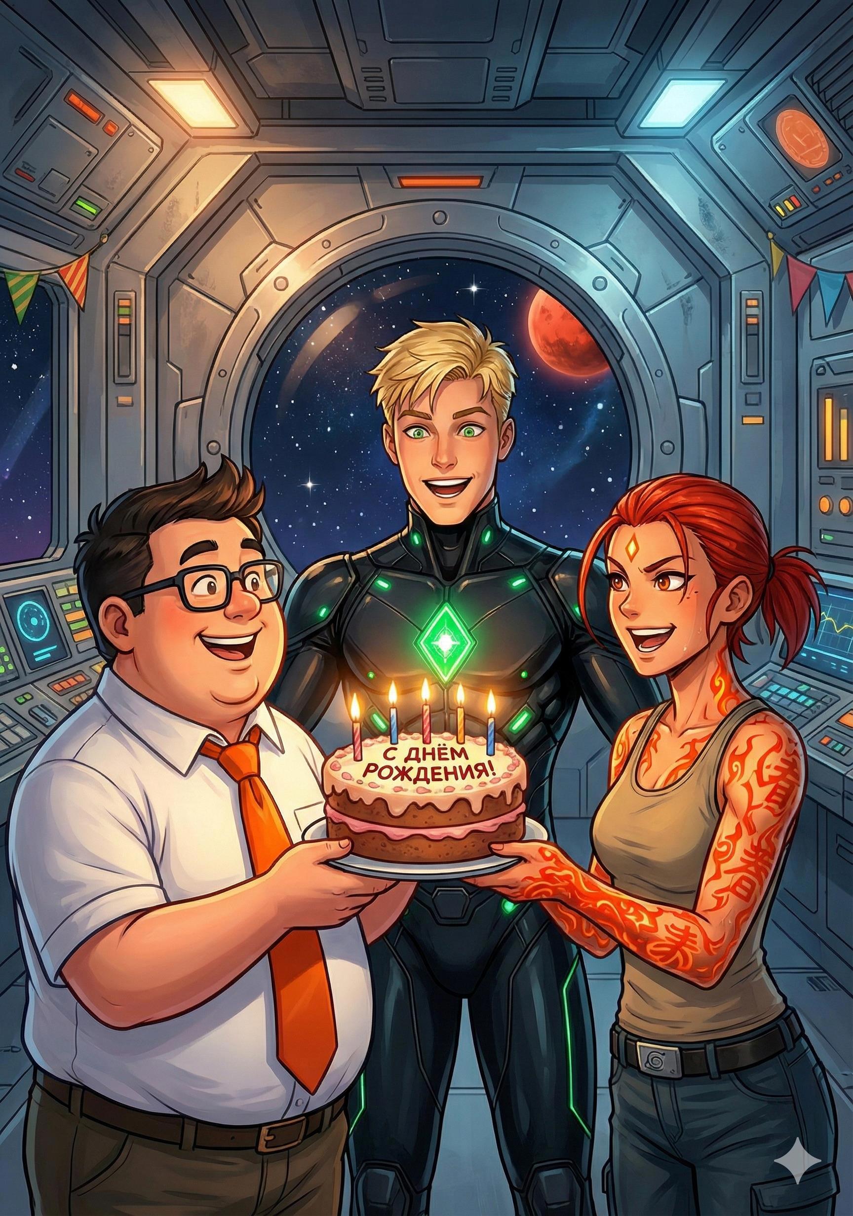 И сегодня Ниида-сан и Оками принесли торт Алексу Бёрну, герою книги Наследник темной звезды хорошего автора Василия Груздева.