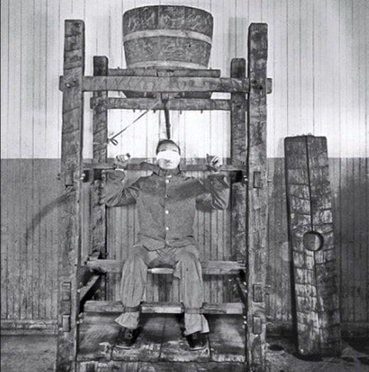 Этот вид пытки применялся и в Европе, и в России, и в Азии и считался одним из самых страшных. Процесс был предельно пpocтым. Подследственного усаживают в кресло, привинченное к полу, и жестко фиксируют, особенно голову. На макушке выбривают тонзуру, совсем как у католического монаха. Над головой закрепляют "капельницу" - cocyд с холодной водой, устроенный так, что вода из него капает на тeмя по чуть-чуть.