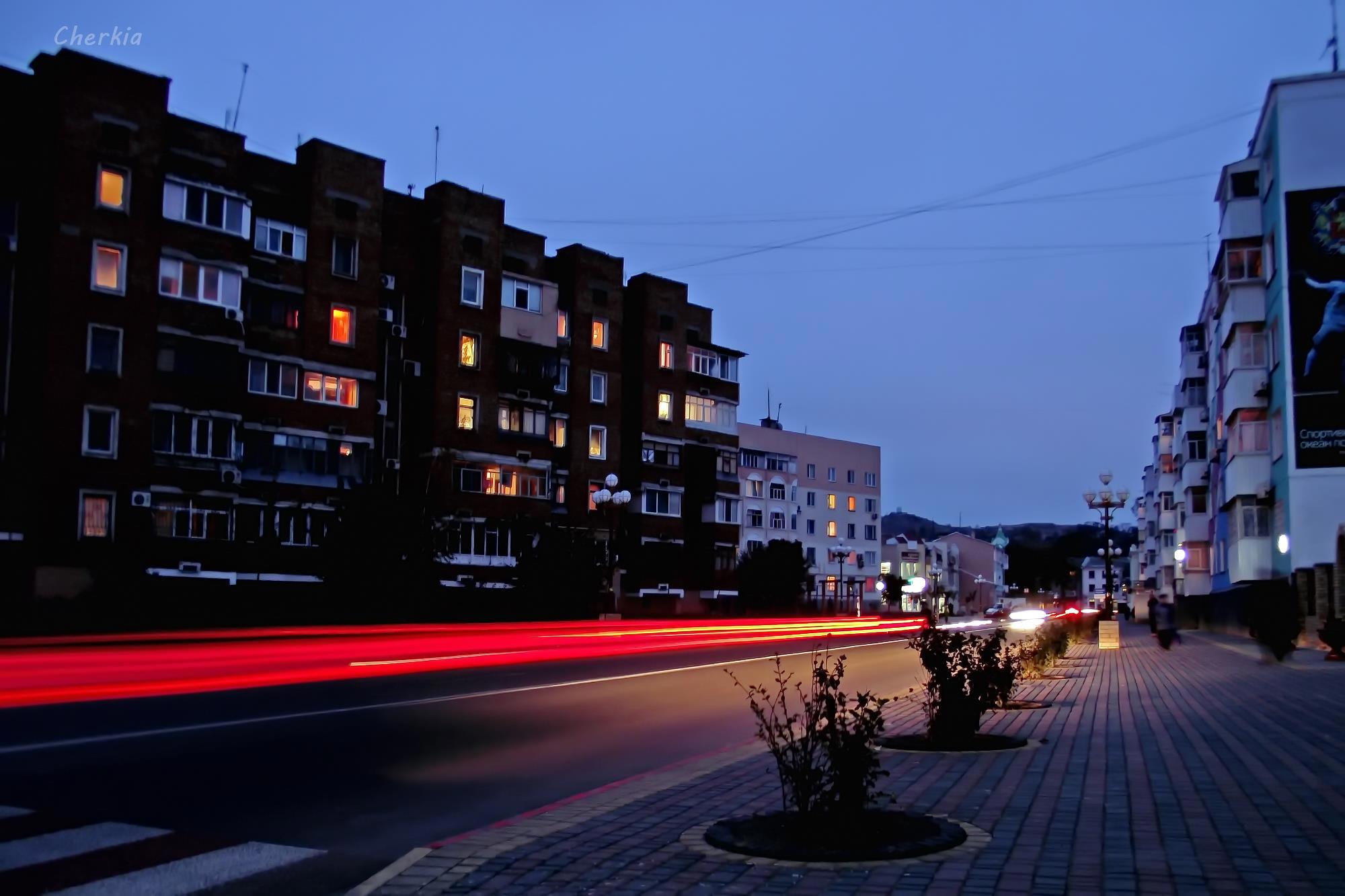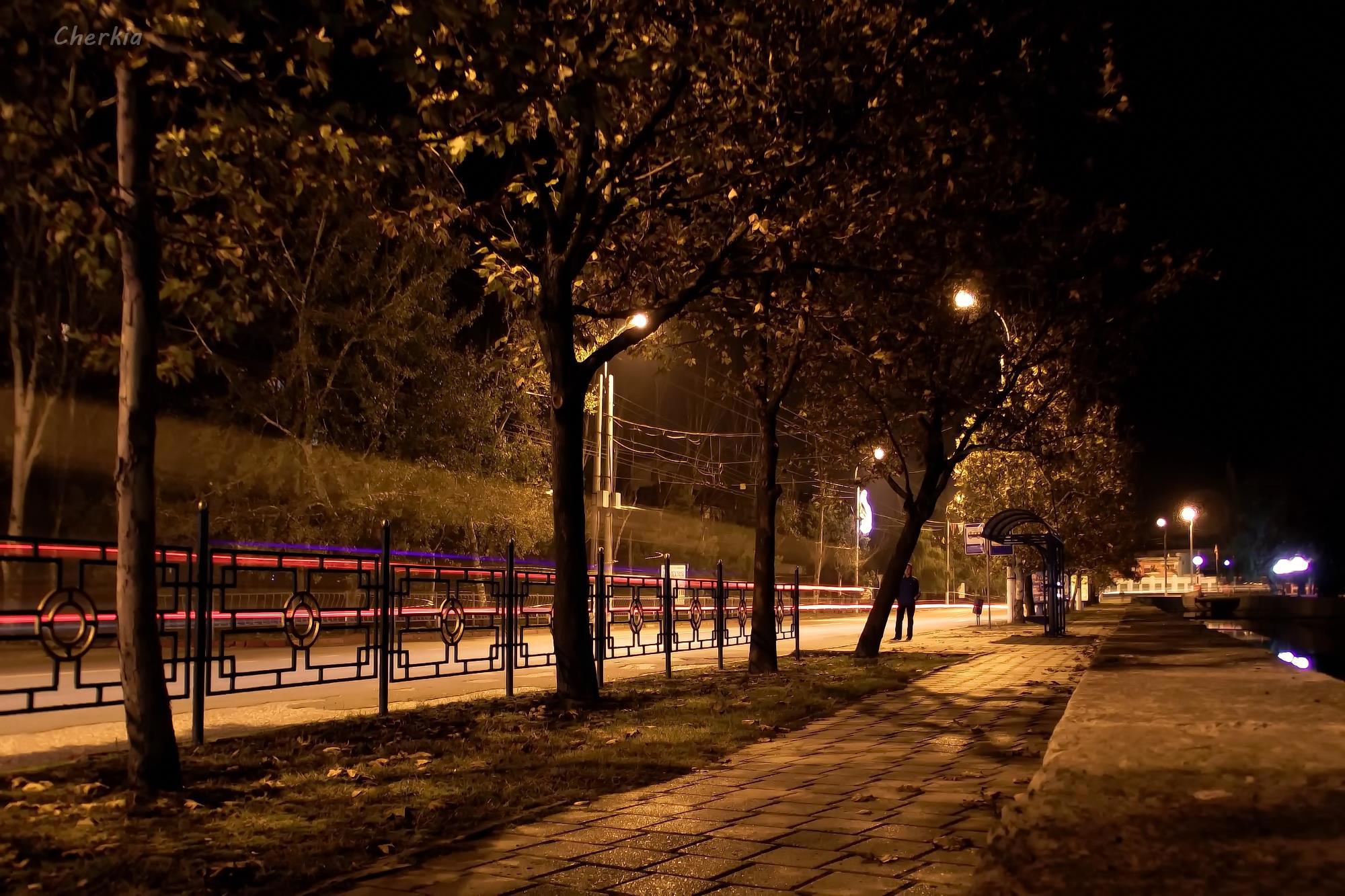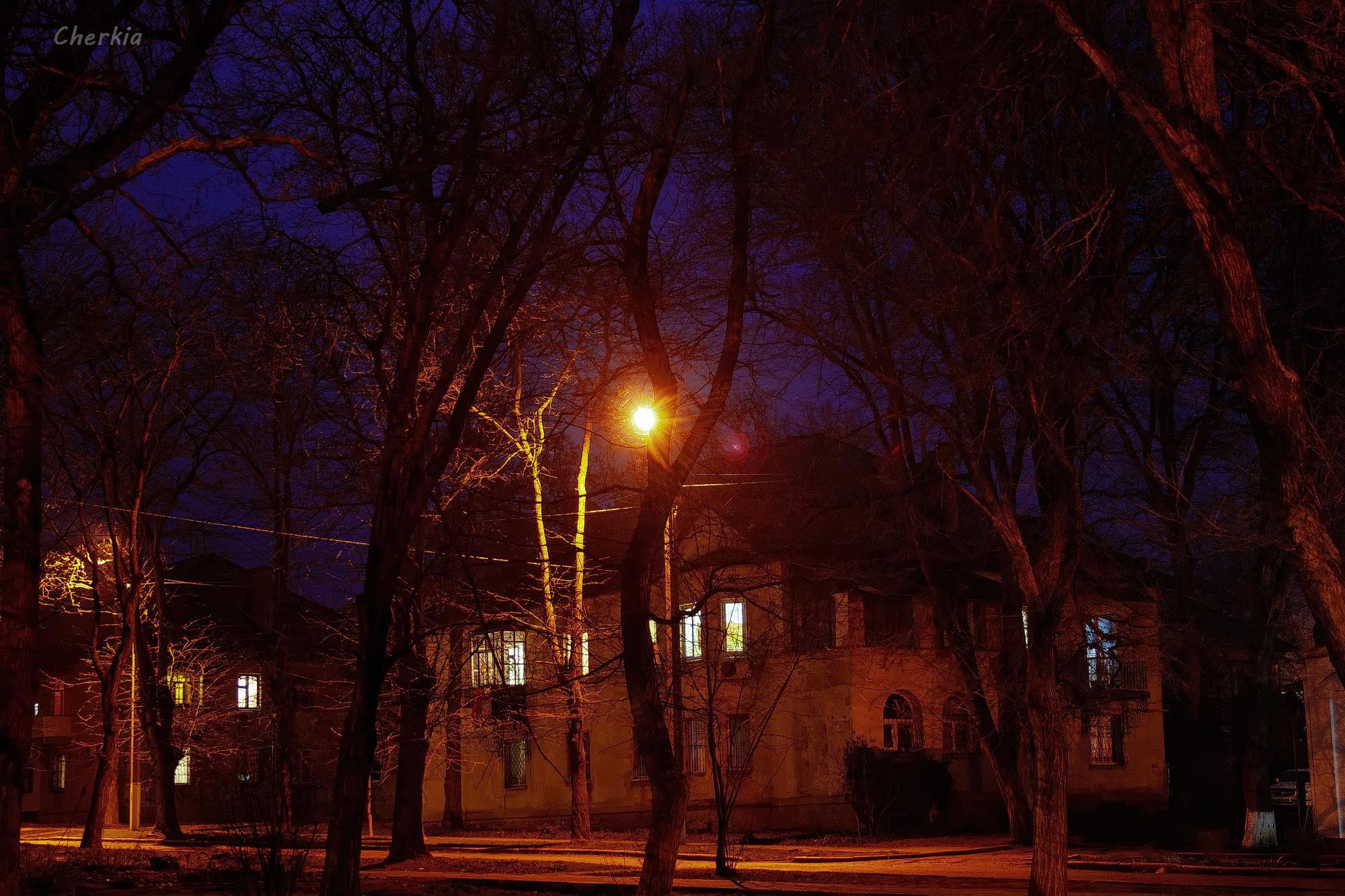 Когда фонари белые, а небо уже ночное, снимок имеет совсем другие оттенки, ближе к сепии.