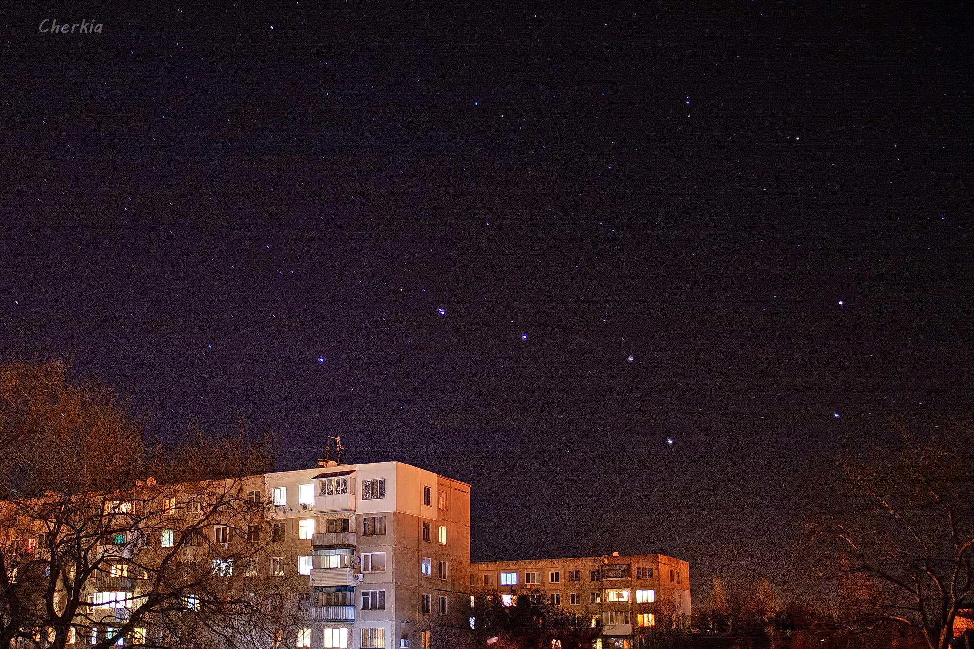 Ну вот, легконогая Кира почти вернулась домой, а над крышами, в совсем ночном небе ярко светит ковш Большой медведицы. Видна даже вторая звездочка на рукоятке ковша. Мицар и Алькор. Мицар - яркая звезда, Алькор более слабая. Интересно, что слово Алькор в переводе с арабского "слабый, забытый". А Мицар - кушак, пояс, набедренная повязка.