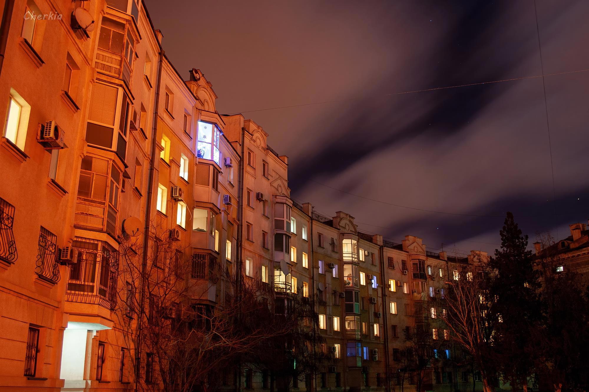 Быстрые облака, подсвеченные городскими огнями. Судя по тому, как их размыло по небу, ветер был хороший.