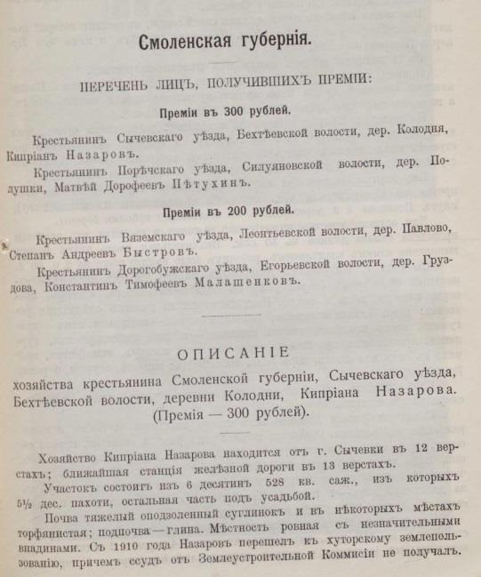 Хозяйство Киприана Назарова из Смоленской губернии - 6 десятин (малоземельный крестьянин по классификации Ленина), чистой прибыли 239 рублей, при общем доходе более тысячи рублей