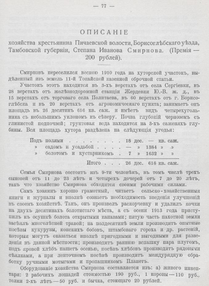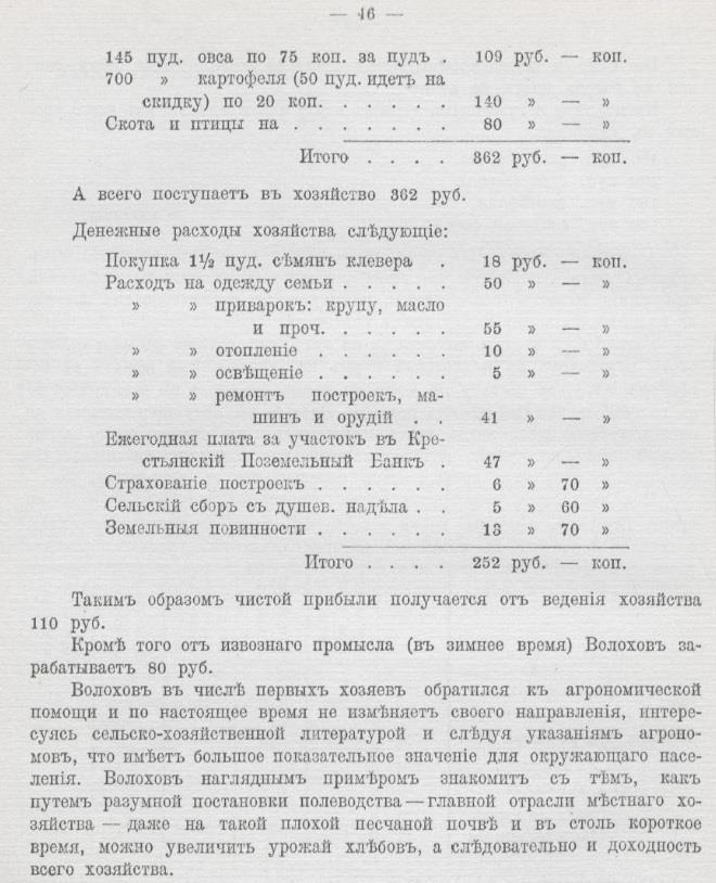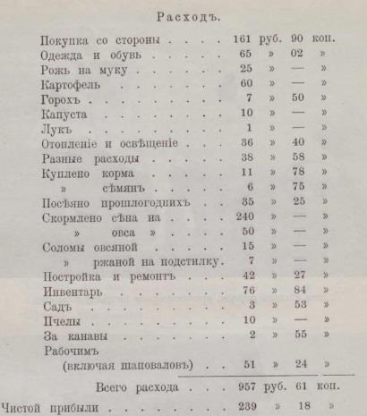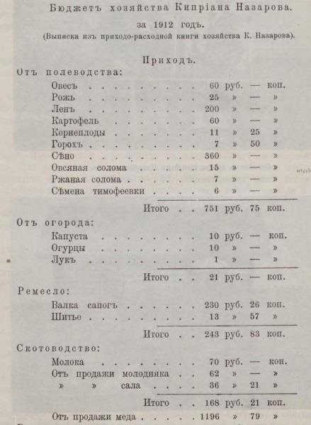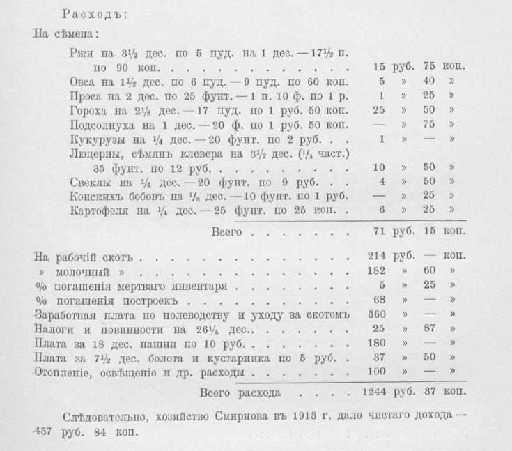 Так у Степана Смирнова Тамбовской губернии, имевшего большой участок в 26 десятин, годовой доход составлял 1682 рубля, все расходы 1244 рубля, чистой прибыли 438 рублей
