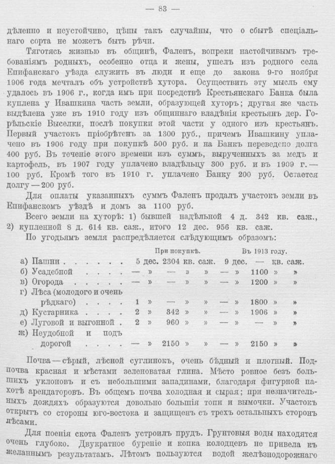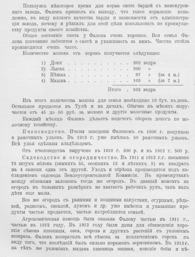 Хозяйство Константина Фалена из Тульской губернии - Фален продал свой надел в общине 1100 рублей, на эти деньги купил 13 десятин плохой земли, где развернул фермерское хозяйство. Доход от одного только пчеловодства составил в 1912 году 500 рублей