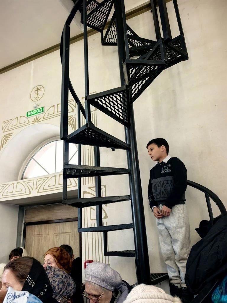 Может, ему стало тесно среди взрослых спин, и он, как исследователь, отправился изучать геометрию храмовой архитектуры. А может, его просто позвала вверх сама лестница — строгая, закрученная, обещающая другую точку зрения. С её высоты храм кажется другим: видно огоньки свечей, узоры на платках, как колышется воздух от тёплого дыхания молитв.