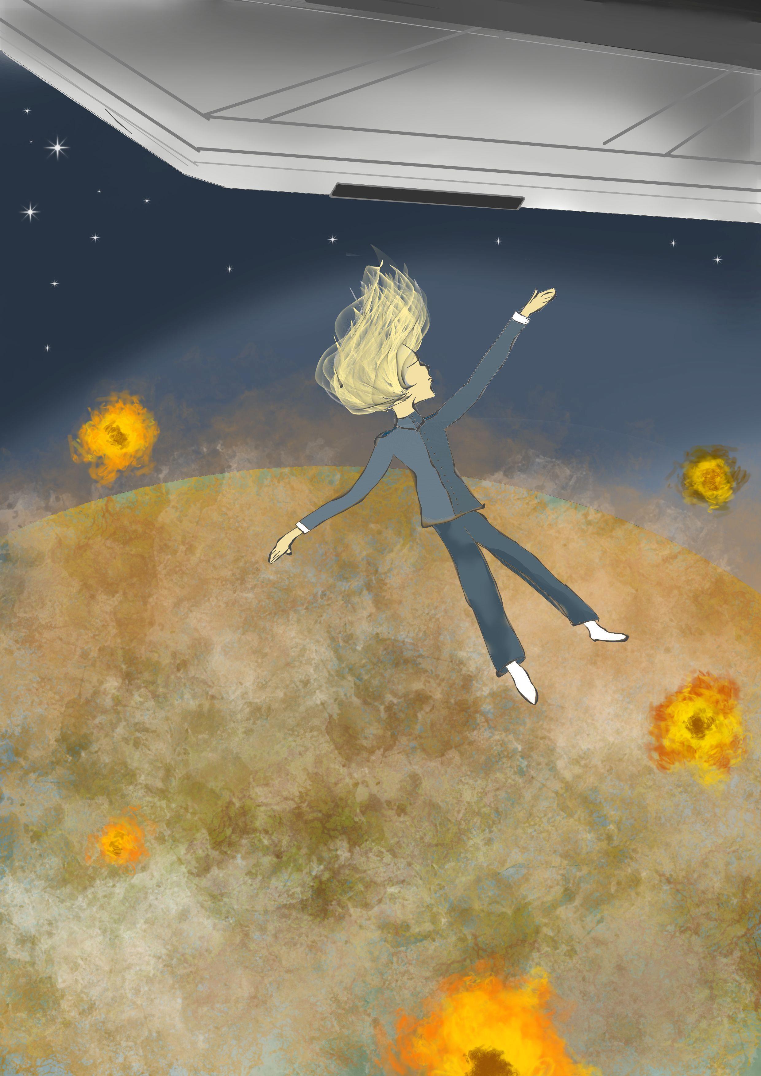 Автор: Наталья СудельницкаяДушенька Дарья Демидова нарисовала мне иллюстрацию к "Кошкам-мышкам". В качестве задания я показала финал всего цикла, когда моя героиня выходит из люка катера и падает вниз навстречу взорвавшимся бомбам.