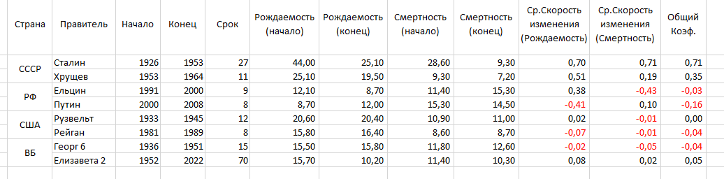Свёл всё в табличку по той методичке, добавил только ещё 3 столбца - Скорость изменения Рождаемости, Скорость изменения Смертности и Среднее между ними. Последнему параметру я даже решил дать своё громкое название, но об этом ниже. Взять решил по два правителя (законченные правления, потому Путин 2000-2008) от каждой из стран. Заодно можно будет не только Сталина с Ельциным сравнить, но и Рузвельта с Елизаветой Второй.