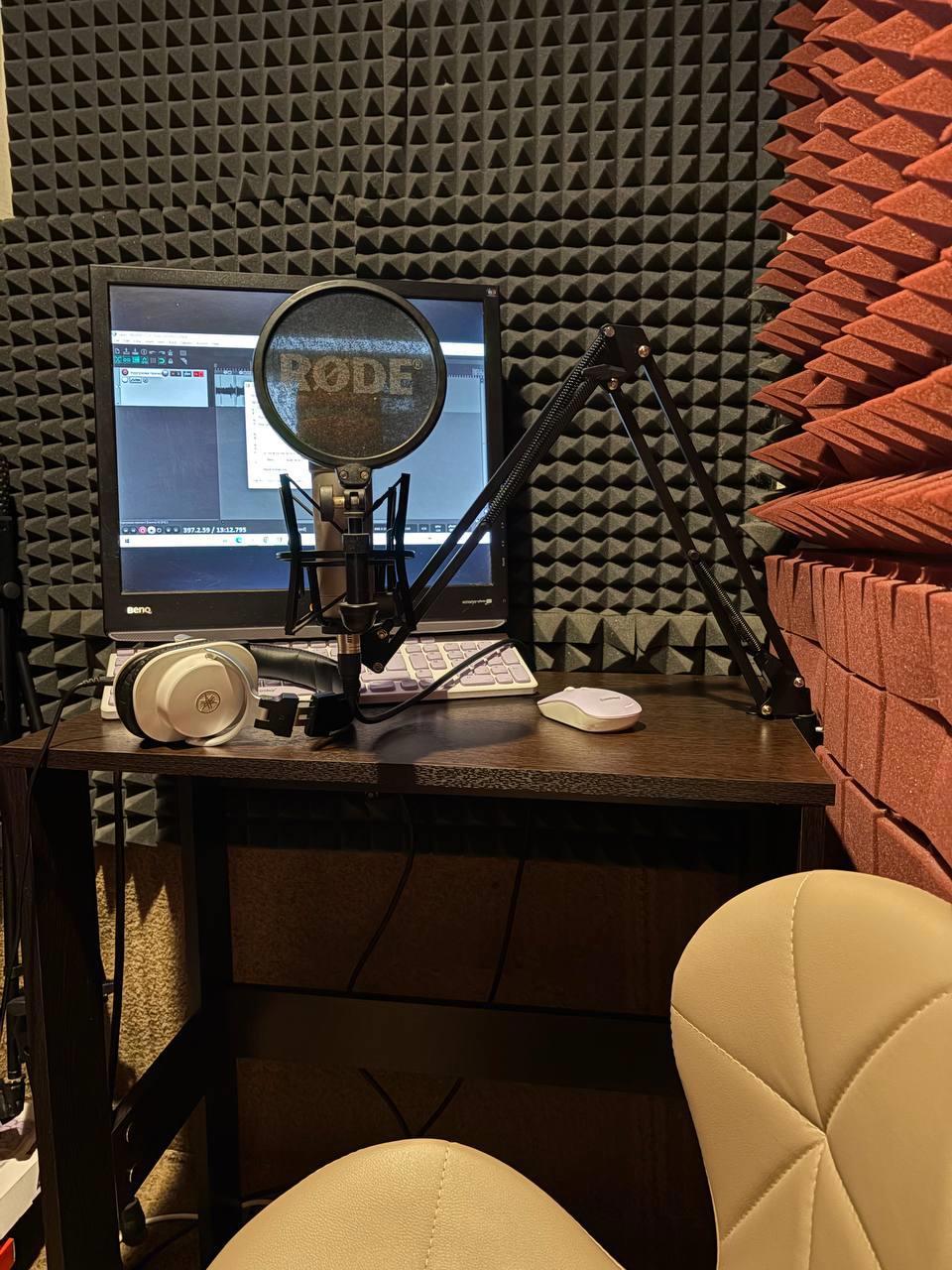 Только недавно завершили обустройство моего рабочего места) Оно в кладовке. Раньше приходилось читать стоя и делить кладовку с дублёнками и куртками, теперь вот как настоящий взрослый диктор, сижу, никакого тряпья, только микрофон, экран, все дела)