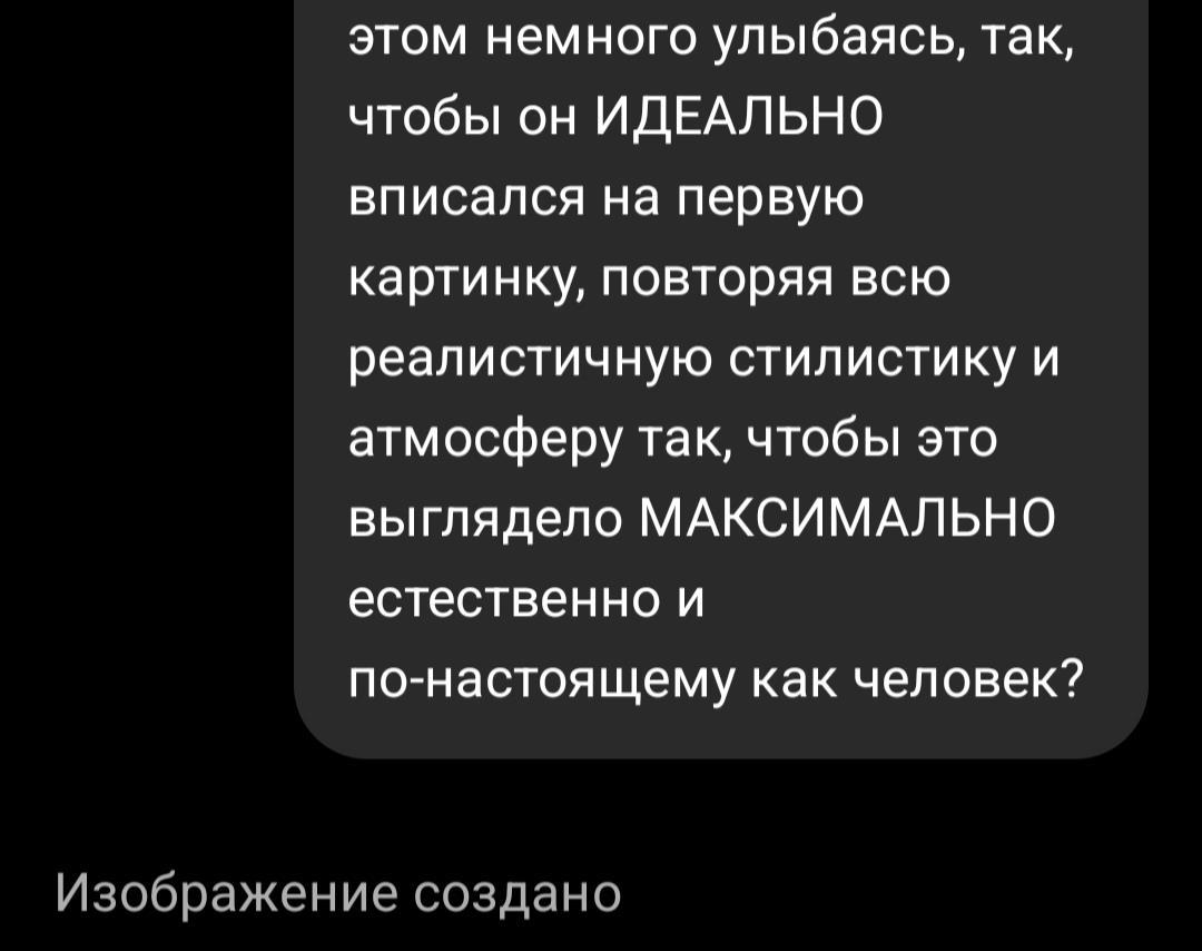 Иногда ещё стоит упомянуть, что ваше реальное фото это тоже «сгенерированная картинка», или ЖПТиха заартачится, мол, обрабатывать фотографии настоящих людей ей не положено... И, собственно, загрузить в запрос и нужную фотку, и картинку с вашим персонажем (предварительно её саму также следует сгенерировать отдельно в как можно более реалистичной стилистике, чтобы нейросеть «запомнила» каноничный образ и могла работать с ним в дальнейшем быстрее).