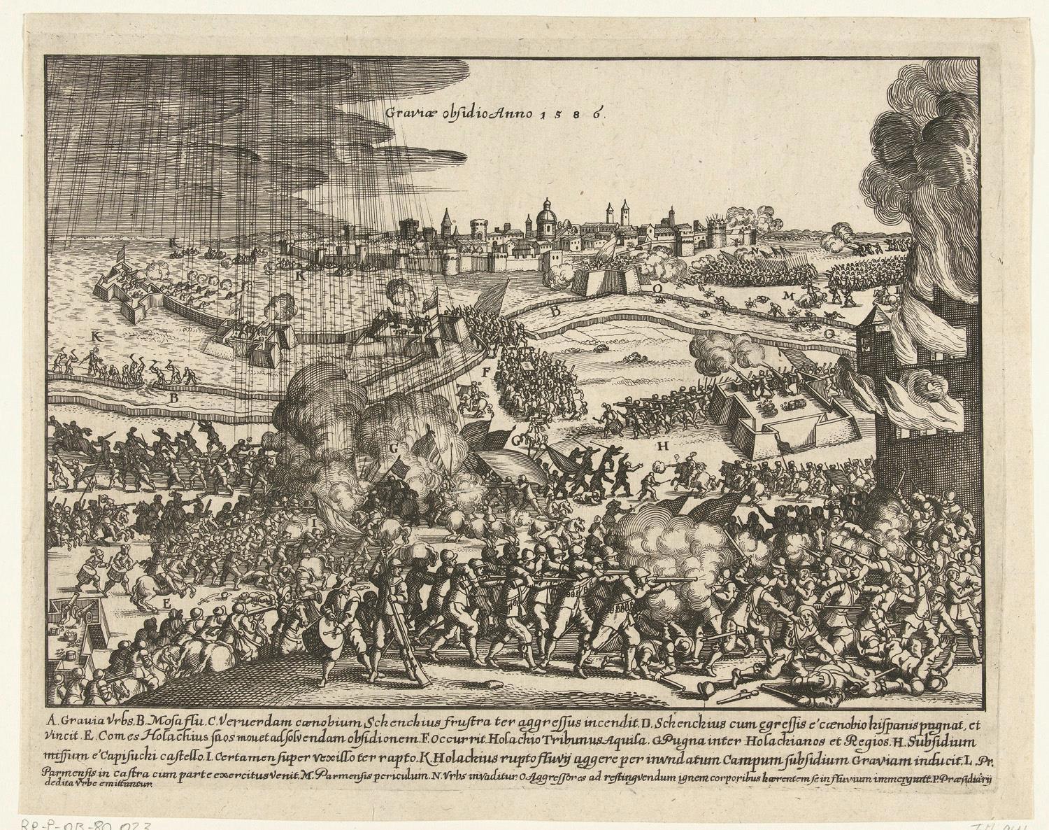 Граве дейстивительно располагался среди дамб и озер, дороги было две и войска Фарнезе, которыми командовал граф Мансфельд отрезали его от снабжения. город находился в осаде три месяца. Англо-голландские войска под началом графа Лестера так и не смогли прийти на помощь осажденным. Несмотря на небольшие успехи отдельных командиров, скоординированного удара не получилось из-за разногласий и непонимания между союзниками. А вот нечего было в Антверпене делить шкуру неубитого медведя.