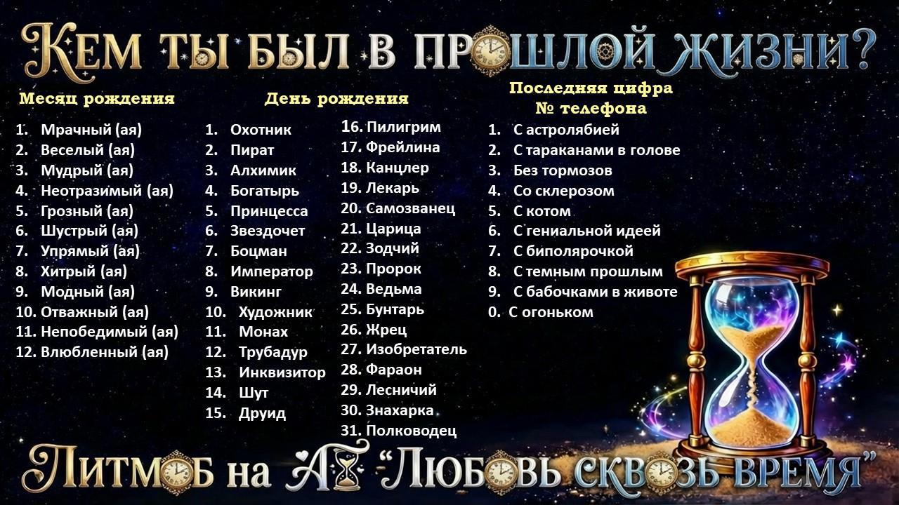 Автор: Ксения НиконоваПока мы с соавтором Натальей Фирст готовимся к старту в литмобе "Любовь сквозь время", предлагаем вам поиграть.