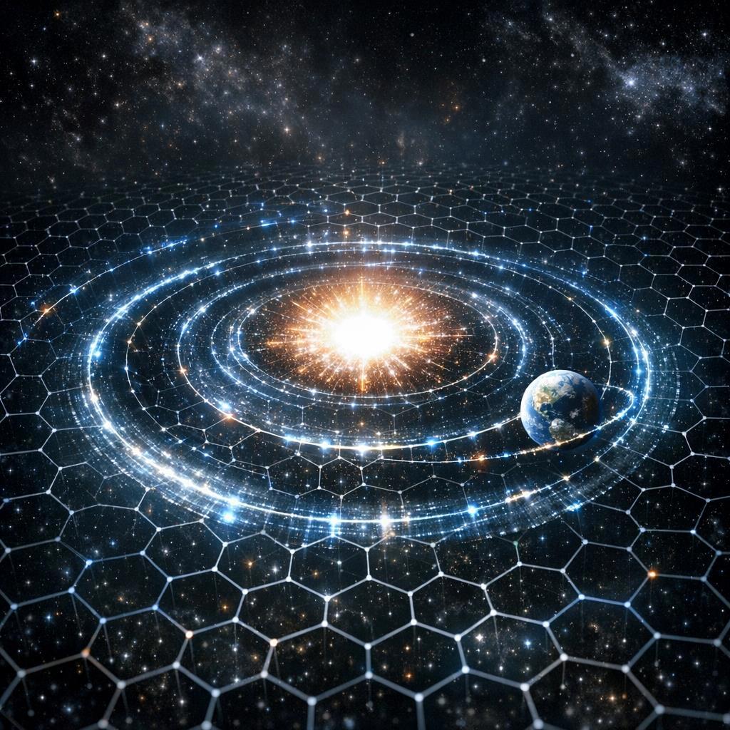 Пока этот апдейт ползёт к нам (а это, на минуточку, 9,25 × 10⁴⁵ тактов, или обновлений состояния решётки), Земля находится в Фантомной Реальности . Почему мы продолжаем вращаться по орбите? Не потому, что пространство искривлено «ямкой», как учит ОТО. Если бы это было так Земля бы начала движение сразу .Потому что в фундаменте - не геометрическая форма, а операционная структура передачи сигналов между ячейками. Ближняя к бывшему Солнцу сторона пространства обновляется медленнее , чем дальняя. Земля постоянно «заворачивает» в сторону более медленных тиков - как мяч, катящийся по склону, где «вниз» = туда, где решётка тормозит сильнее. Мы падаем в вычислительную яму, которой уже нет. Мы живём в прошлом. Наш локальный участок сети ещё не получил пакет данных о том, что центр пуст.