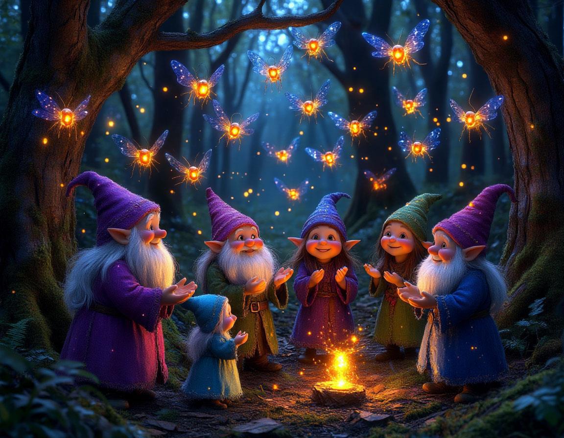 Гномы и феи жили в мире и согласии. Гномы заботились о земле, укрепляли корни деревьев и следили за чистотой ручья, а феи наполняли лес светом, музыкой и добрыми снами. Иногда, когда луна была полной, гномы выходили из своих нор, чтобы полюбоваться танцами фей, а феи спускались вниз, чтобы послушать мудрые истории старейшин гномов.