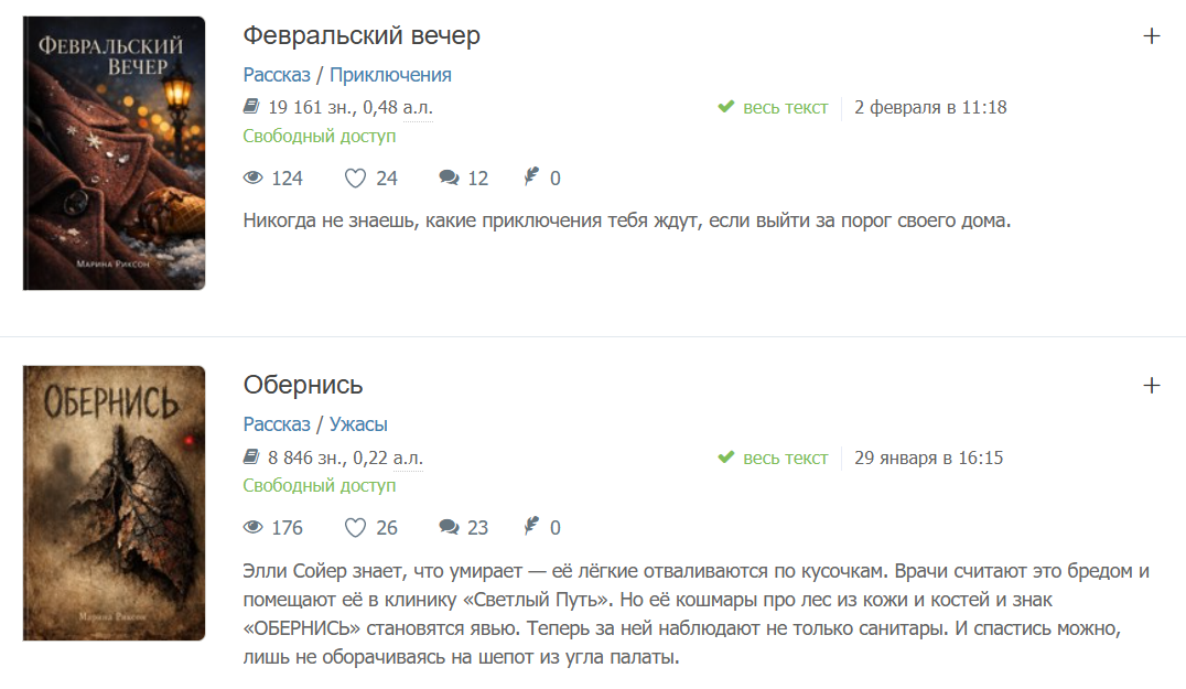 На данный момент она написала всего два рассказа в жанрах приключения и ужасы. Был бы вам благодарен, если бы вы обратили внимание на ее творчество и оценили его, может даже указали что улучшить а что оставить как есть.