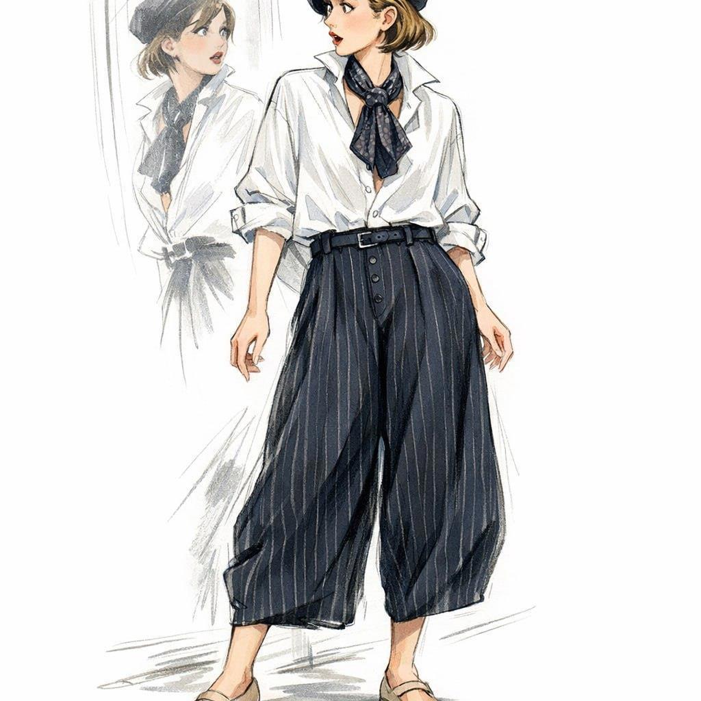 Расширяющиеся от самого бедра, ничем на первый взгляд не отличимые от юбки-клош… но всё же брюки! С высокой посадкой на мужской манер и самой настоящей ширинкой на пуговицах. Дерзкая длина до середины икры вкупе с открытыми туфельками оголяла щиколотку — вот как есть подросток-сорванец!